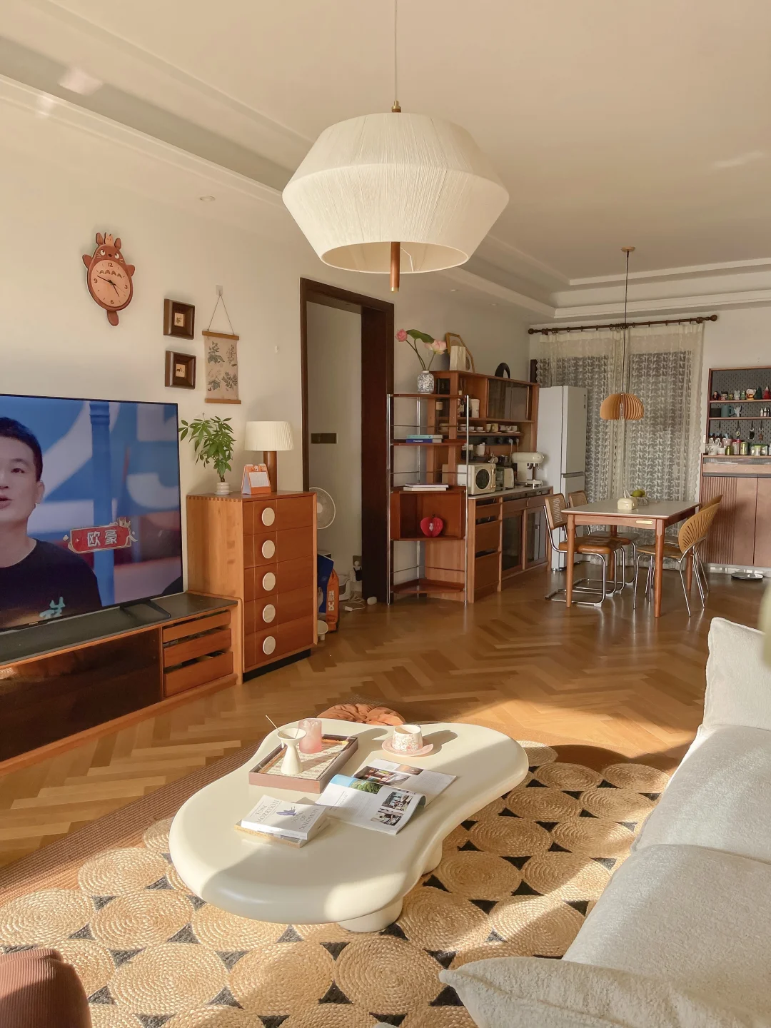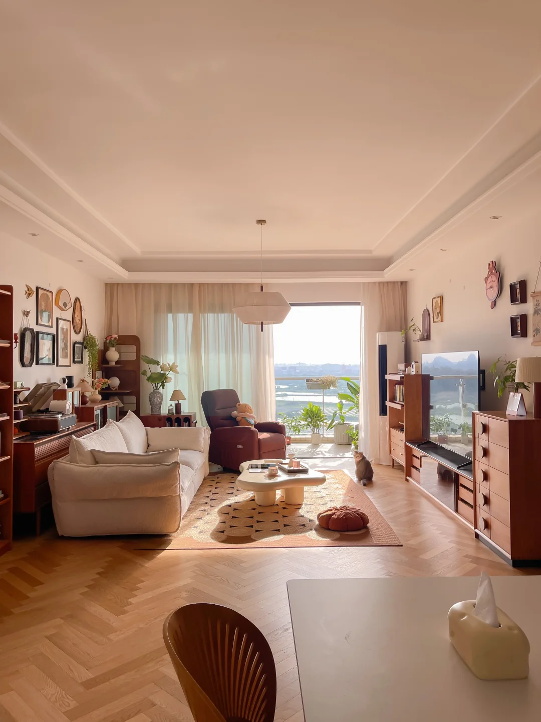 🍃家具选择:原木色的客厅边柜,两层分区满足多元收纳需求,底部还有双抽储物太棒啦~和我家超搭的!