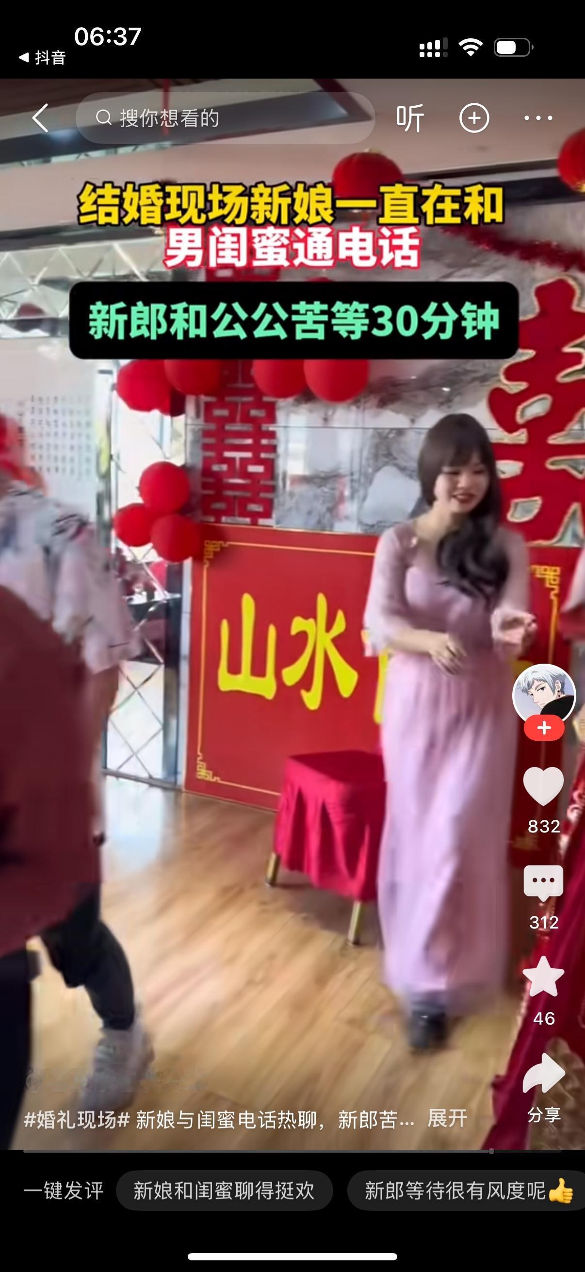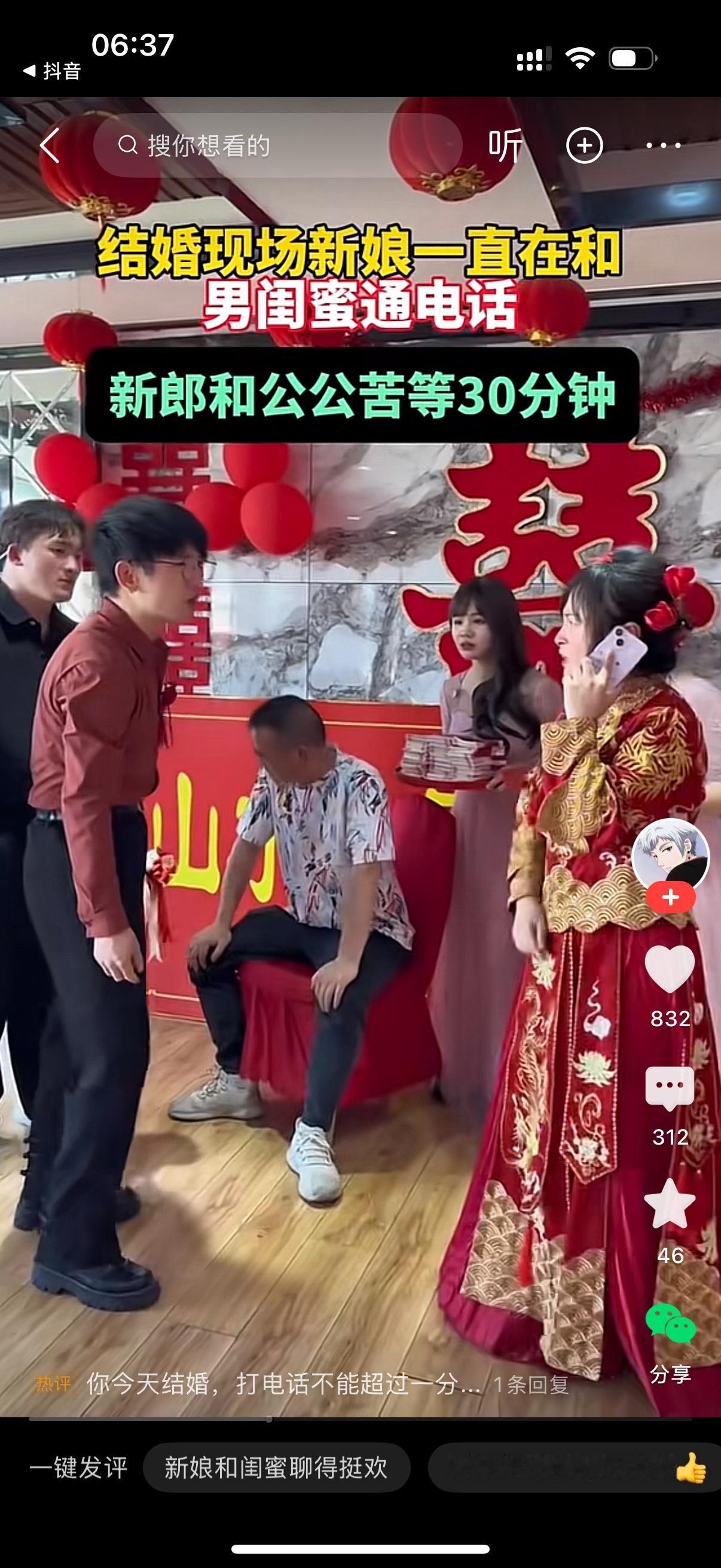 结婚现场,新娘一直和男闺蜜通电话。新郎和公公等了她近30分钟,她还在打电话。新郎最后一次叫她不要打了,马上要举行仪式了。新娘却说还要给前男友打个电话做最后的告别。新郎彻底怒了,拿上彩礼,转身就走,这个婚不结了。新娘急的直跺脚。女人活该,男子做的对。