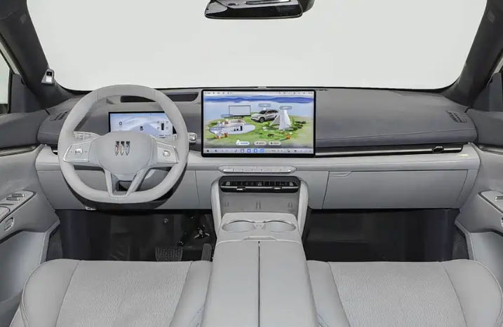 新车外观延续至境SUV概念车“展翼元素”设计理念,采用了新能源车流行的封闭式前脸,勾勒出驭风鲨鱼前脸设计语言,搭配造型别致的分体式星河展翼大灯组,上方的日间行车灯光源采用了修长的C型设计,下方的主照明光源也进行了流水式处理。车侧采用半隐藏式车门把手,搭配20英寸密辐式轮圈。车身长宽高尺寸为4850×1910×1676mm,轴距为2850mm。车尾加入了别克至境家族的发散式尾灯,点亮后光源从中央的BUICK车标向外延伸。车顶配备激光雷达,将搭载“逍遥智行”辅助驾驶系统,依托Momenta R6强化学习大模型,拥有全场景辅助驾驶能力。颜色将提供松烟墨、缎光银、金沙米、远山黛四款外观颜色。