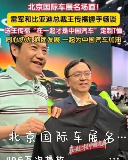 车展上有意思的是雷军准备了一连串藏着段子的半袖,挨个儿送到各家竞争对手手里。雷军跑到比亚迪展台时,一本正经地掏出了一件印着“在一起才是中国汽车”的定制半袖,转身送给王传福这位新能源行业的老大哥。另外雷军给李想送的半袖上印着“听我讲完”,雷军现场调侃上次被他硬控半小时,这次得听他讲完。可以说整个车展是热闹不已。
