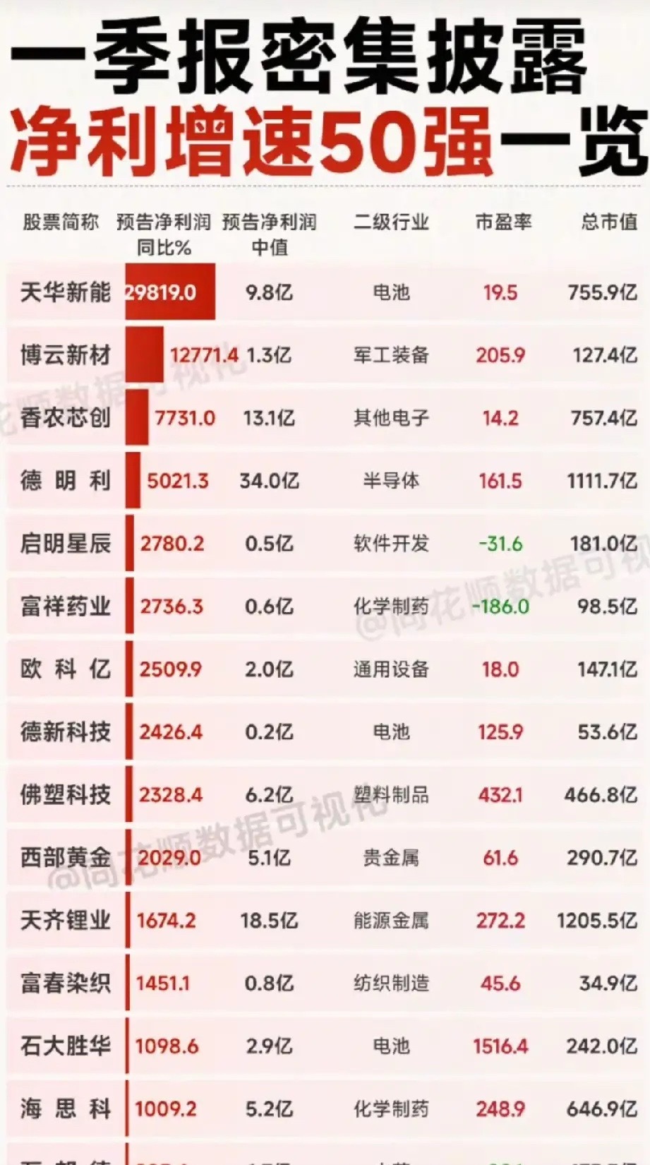 一季报净利狂飙榜:近300倍增速领跑,多赛道企业业绩大爆发!本次梳理的一季报净利增速榜覆盖电池、半导体、通用设备等多赛道,头部企业增速近300倍,锂电、半导体表现突出,估值分化明显,部分标的低估值匹配高增速,也有企业因低基数实现高增。个股梳理分析1. 天华新能:电池赛道,预告净利中值9.8亿,同比增速近300倍,市盈率19.5,低估值匹配超高增速,锂电核心标的。2. 博云新材:军工装备赛道,预告净利中值1.3亿,同比增速超127倍,市盈率205.9,增速亮眼但估值偏高。3. 香农芯创:其他电子赛道,预告净利中值13.1亿,同比增速超77倍,市盈率14.2,低估值高增速,电子分销业务强劲。4. 德明利:半导体赛道,预告净利中值34.0亿,同比增速超50倍,市盈率161.5,存储芯片带动业绩高增,估值偏高。5. 启明星辰:软件开发赛道,预告净利中值0.5亿,同比增速超27倍,市盈率为负,增速源于低基数,尚未盈利修复。6. 富祥药业:化学制药赛道,预告净利中值0.6亿,同比增速超27倍,市盈率为负,原料药业务修复,仍处亏损状态。7. 欧科亿:通用设备赛道,预告净利中值2.0亿,同比增速超25倍,市盈率18.0,数控刀具业务稳定,低估值匹配高增速。8. 德新科技:电池赛道,预告净利中值0.2亿,同比增速超24倍,市盈率125.9,锂电设备带动业绩高增,市值规模偏小。9. 佛塑科技:塑料制品赛道,预告净利中值6.2亿,同比增速超23倍,市盈率432.1,新能源材料增长显著,估值处于高位。10. 西部黄金:贵金属赛道,预告净利中值5.1亿,同比增速超20倍,市盈率61.6,受益金价上行,业绩与估值匹配度尚可。11. 天齐锂业:能源金属赛道,预告净利中值18.5亿,同比增速超16倍,市盈率272.2,锂矿龙头业绩修复,高增速伴随高估值。12. 富春染织:纺织制造赛道,预告净利中值0.8亿,同比增速超14倍,市盈率45.6,色纱业务表现良好,小市值标的增速亮眼。13. 石大胜华:电池赛道,预告净利中值2.9亿,同比增速超10倍,市盈率1516.4,锂电溶剂业务增长可观,市盈率极高。14. 海思科:化学制药赛道,预告净利中值5.2亿,同比增速超10倍,市盈率248.9,创新药业务带动业绩高增,估值偏高。15. 万邦德:中药赛道,预告净利中值1.7亿,同比增速近10倍,市盈率为负,中药业务业绩改善,尚未实现盈利修复。16. 龙蟠科技:电池赛道,预告净利中值2.3亿,同比增速近10倍,市盈率为负,锂电材料业绩修复,仍处亏损状态。17. 恒星科技:通用设备赛道,预告净利中值0.6亿,同比增速近9倍,市盈率351.9,金属制品业务增长显著,高增速伴高估值。18. 盛达资源:工业金属赛道,预告净利中值0.8亿,同比增速超8倍,市盈率49.5,有色金属业务良好,估值相对合理。19. 博腾股份:医疗服务赛道,预告净利中值0.3亿,同比增速超7倍,市盈率104.5,CDMO业务业绩修复,增速可观估值偏高。20. 强一股份:半导体赛道,预告净利中值1.1亿,同比增速超7倍,市盈率132.3,半导体设备带动业绩高增,估值处于高位。21. 赣锋锂业:能源金属赛道,预告净利中值18.5亿,同比增速超6倍,市盈率110.6,锂矿龙头业绩修复,增速估值匹配尚可。22. 新锐股份:通用设备赛道,预告净利中值3.0亿,同比增速超5倍,市盈率82.1,硬质合金业务稳定,估值处于合理区间。23. 联讯仪器:通用设备赛道,预告净利中值1.2亿,同比增速超5倍,市盈率486.9,测试仪器业务增长显著,估值极高。24. 宁波富邦:电网设备赛道,预告净利中值0.3亿,同比增速近5倍,市盈率39.2,铝加工业务良好,小市值低估值增速亮眼。25. 华锐精密:通用设备赛道,预告净利中值1.7亿,同比增速近5倍,市盈率17.0,数控刀具业务强劲,低估值匹配高增速。26. 金山办公:软件开发赛道,预告净利中值21.6亿,同比增速超4倍,市盈率13.2,办公软件龙头,低估值高增速,基本面扎实。27. 东岳硅材:化学制品赛道,预告净利中值1.9亿,同比增速超4倍,市盈率23.2,有机硅受益行业回暖,低估值匹配高增速。28. 远大控股:贸易赛道,预告净利中值0.6亿,同比增速超3倍,市盈率为负,大宗商品贸易增长,增速源于低基数效应。总结整体来看,锂电、半导体、通用设备三大赛道表现突出,多数标的受益行业回暖与低基数实现业绩爆发。估值分化明显,部分标的低估值高增速,也有标的估值偏高或仍处亏损,需关注业绩持续性。本文涉及资讯内容来自网络,仅供参考不构成投资建议!