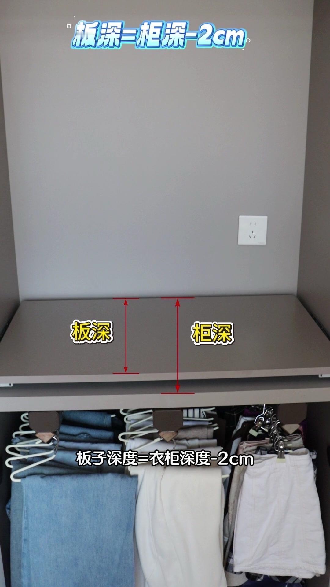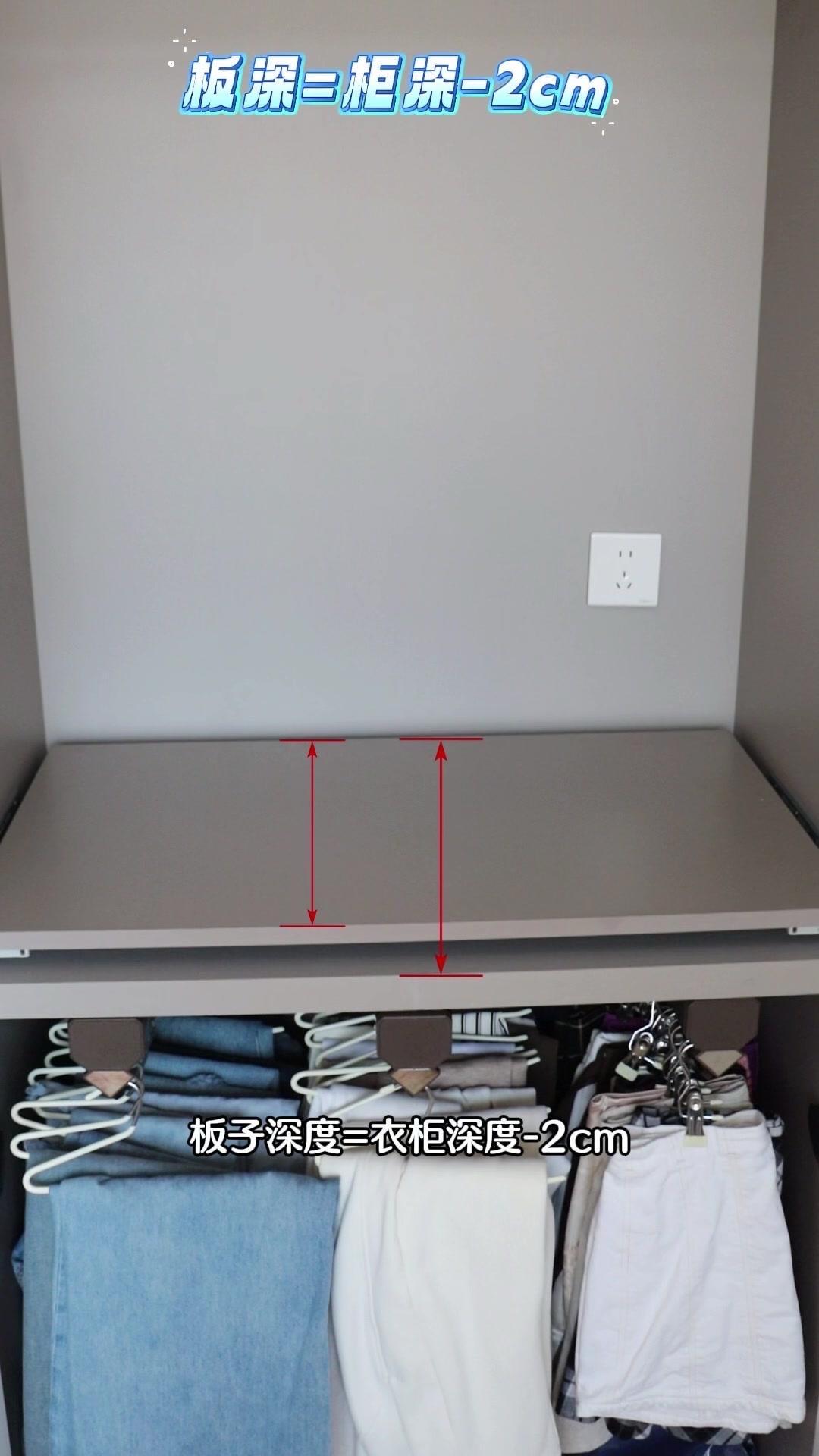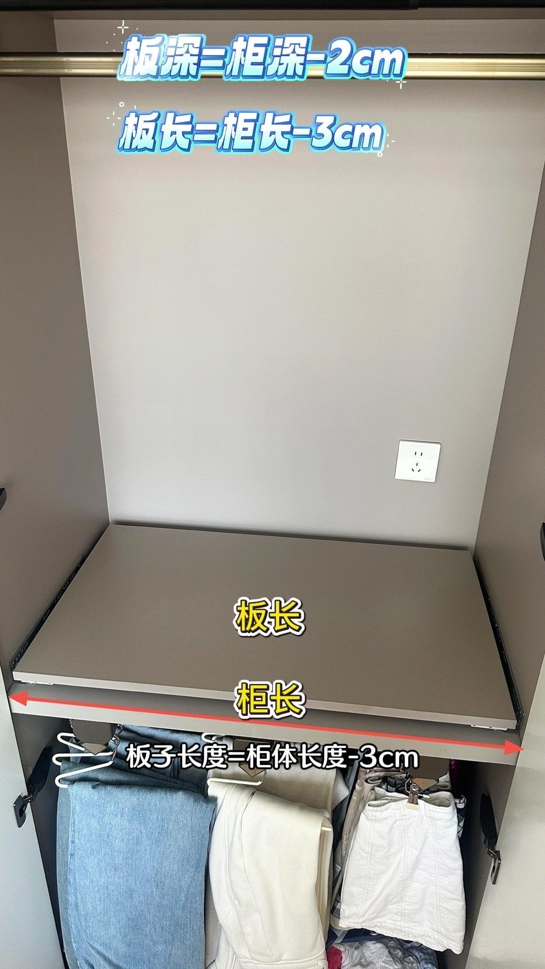 1️⃣定制木板:在网上搜“衣柜板”定制一块和衣柜同色的木板,尺寸要注意:深度=衣柜深度-2cm(留推进空间),长度=柜体长度-3cm(左右各减1.5cm防撞门),一块才40多块超便宜!