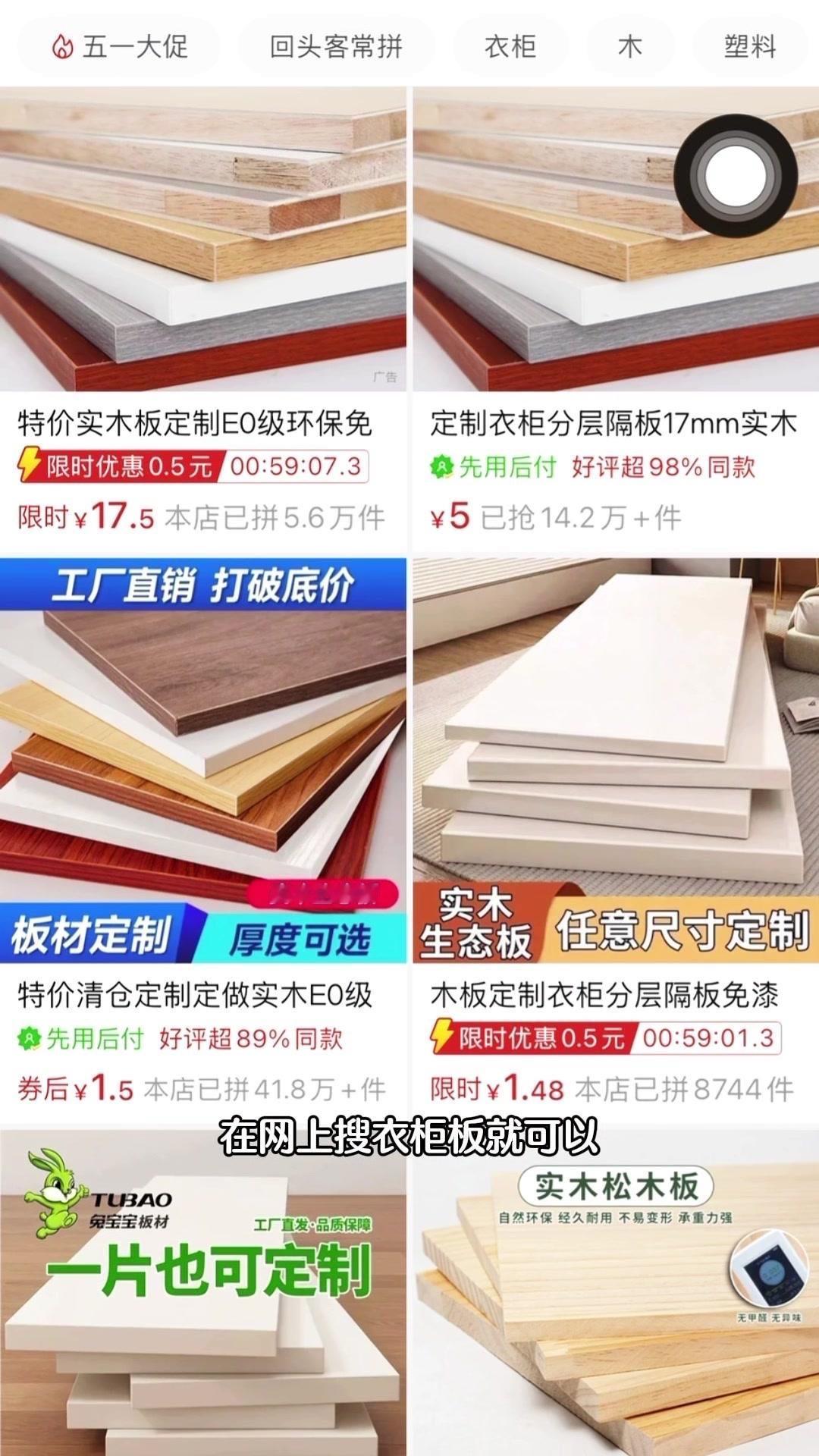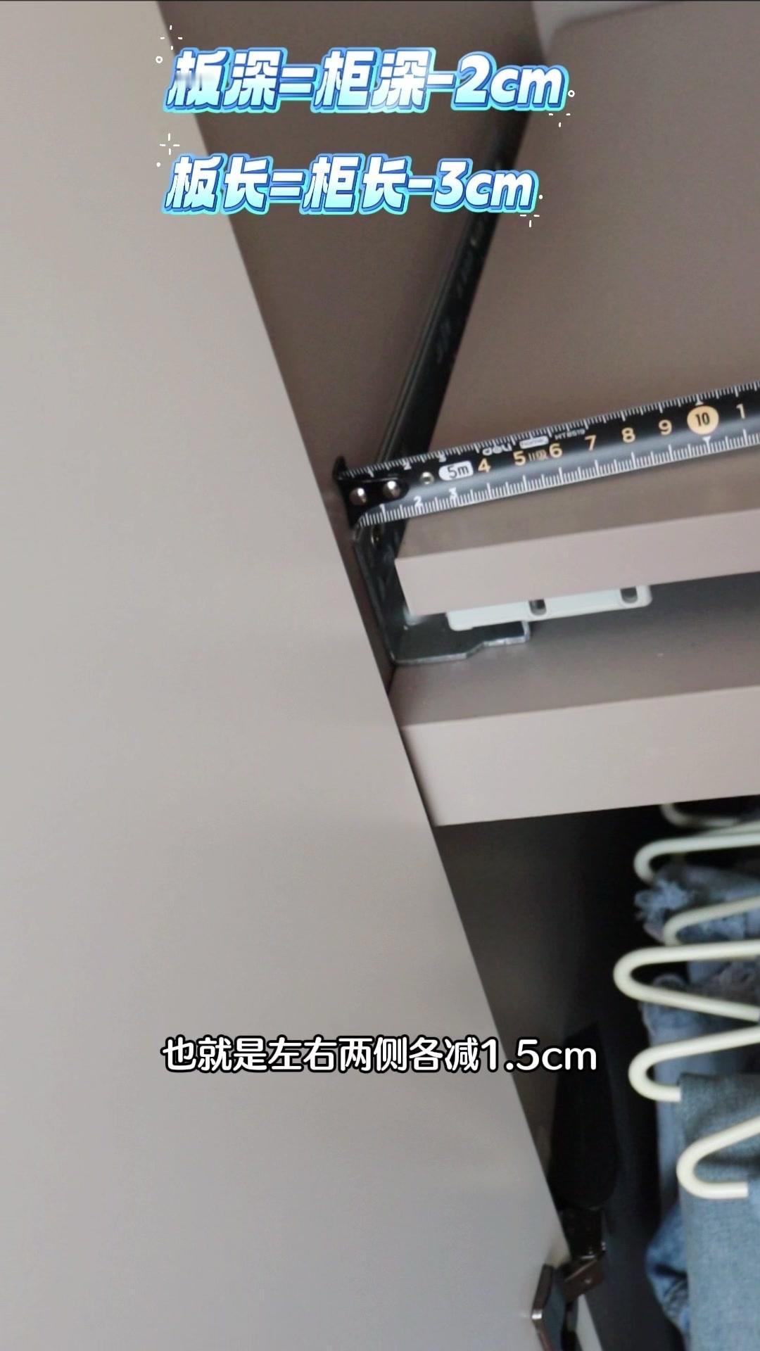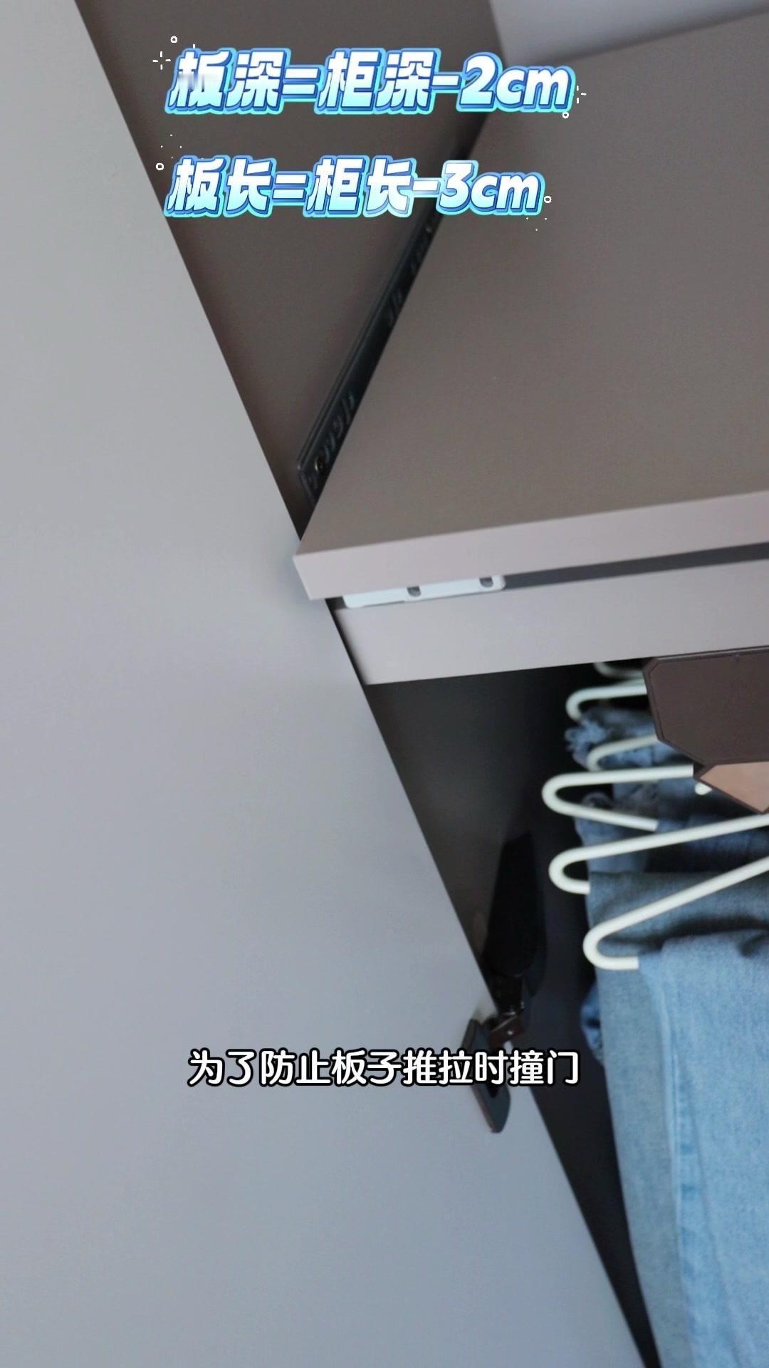 1️⃣定制木板:在网上搜“衣柜板”定制一块和衣柜同色的木板,尺寸要注意:深度=衣柜深度-2cm(留推进空间),长度=柜体长度-3cm(左右各减1.5cm防撞门),一块才40多块超便宜!