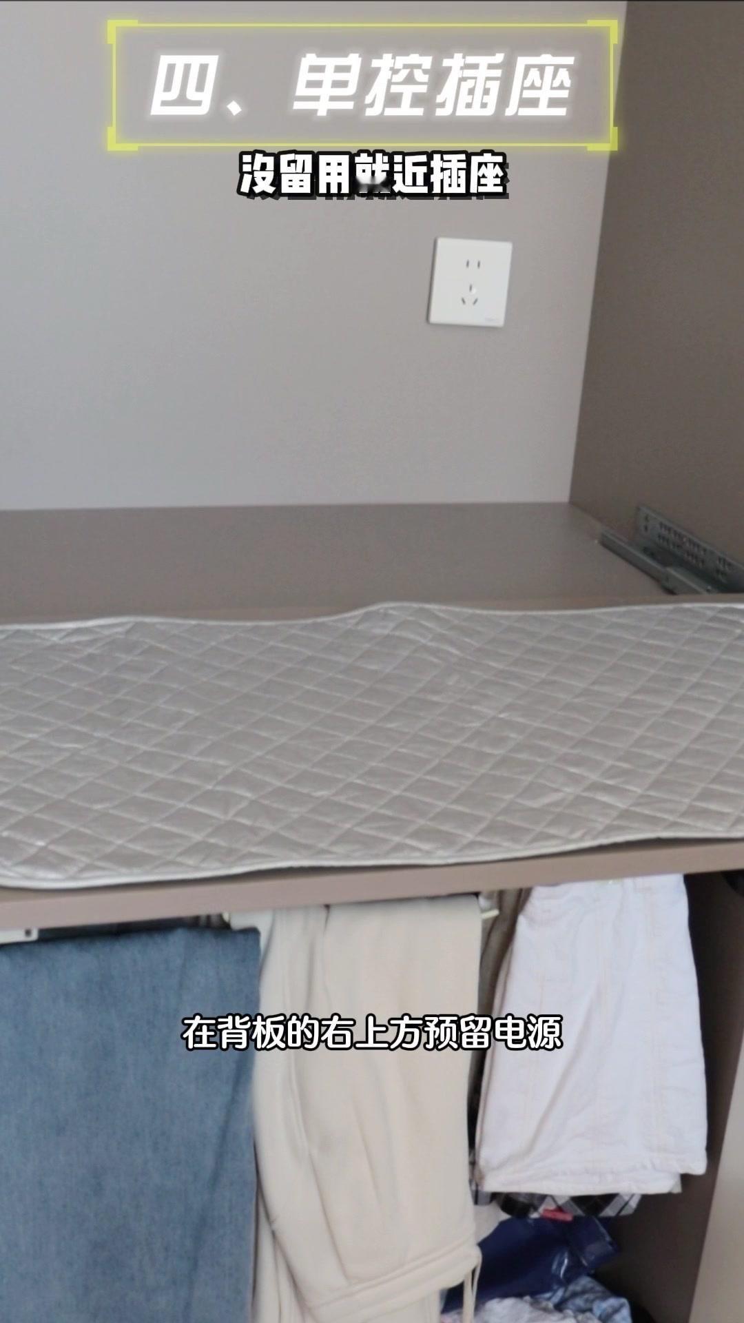 3️⃣加熨衣垫:选尺寸合适的熨衣垫,熨衣服多的话买厚点的。背板右上方记得预留15-20cm的电源高度,配单控开关,安全又方便。