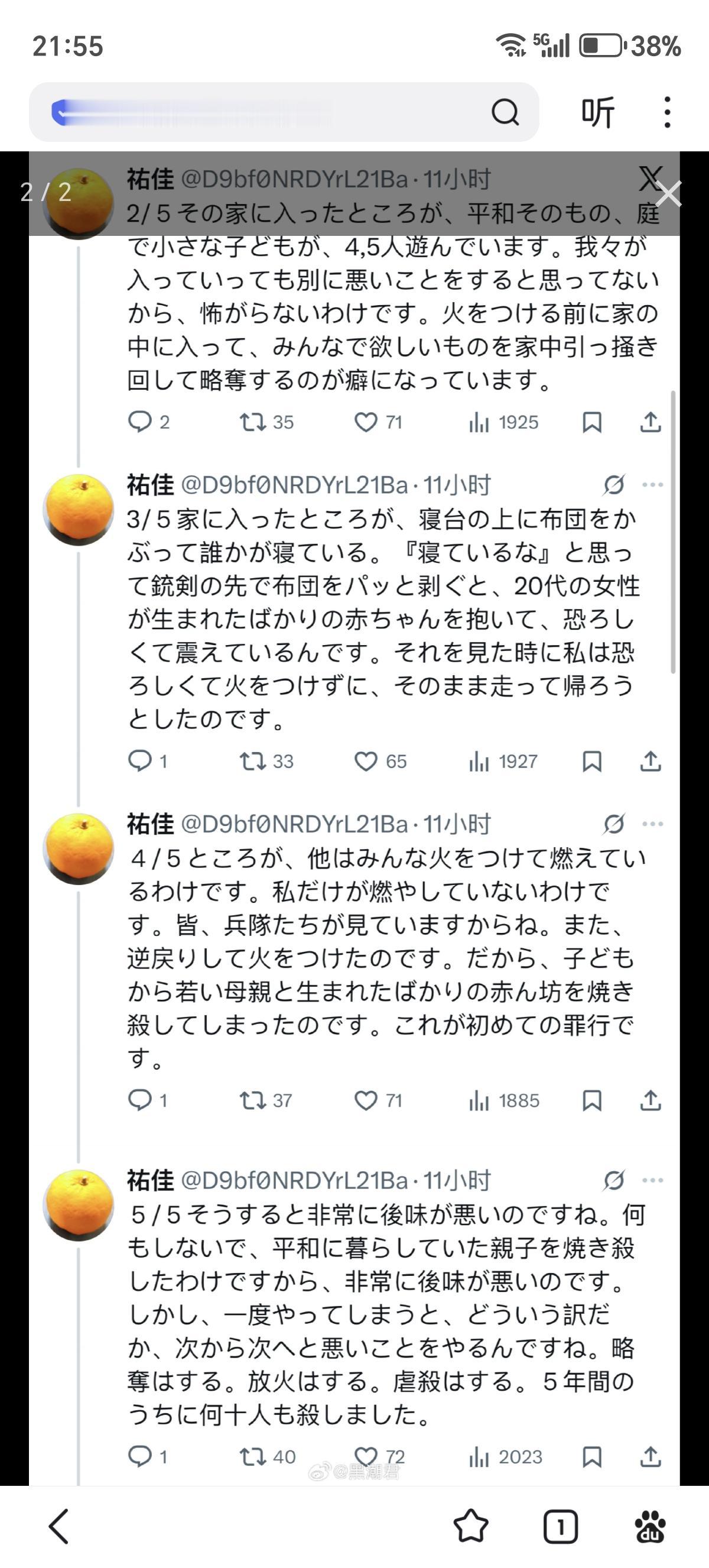 做完之后,心里非常难受。因为我把这对过着平静生活、毫无过错的母子烧死了,所以极其痛苦。但是,一旦开了头,不知怎么回事,坏事就一件接一件地干了下去。抢劫、放火、屠杀。在五年的时间里,我杀了几十个中国人。