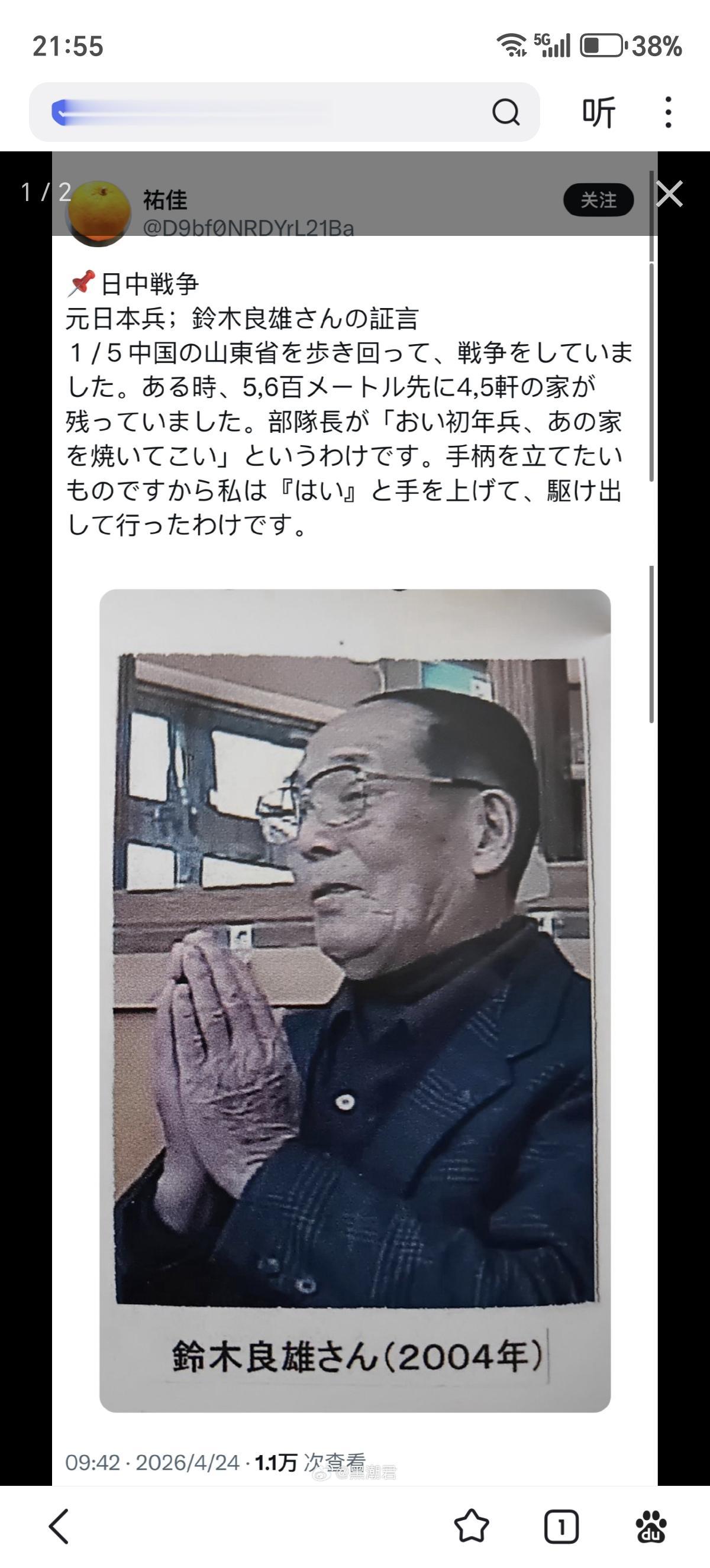 当时我们在中国山东省一带行军作战。有一次,在五六百米外还剩下四五户人家。部队长对我说:“喂,新兵,去把那几家房子烧掉。”因为我也想立个功,就应了声“哈伊”,举起手,跑了过去。