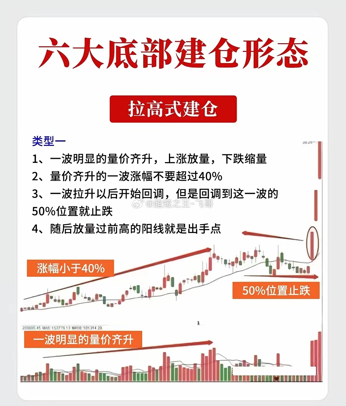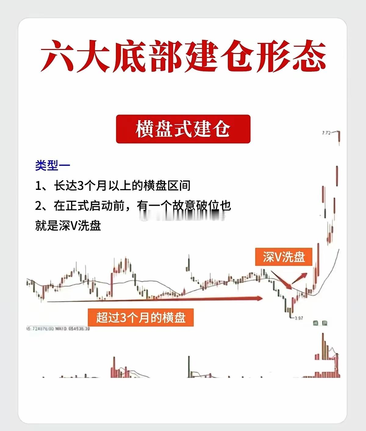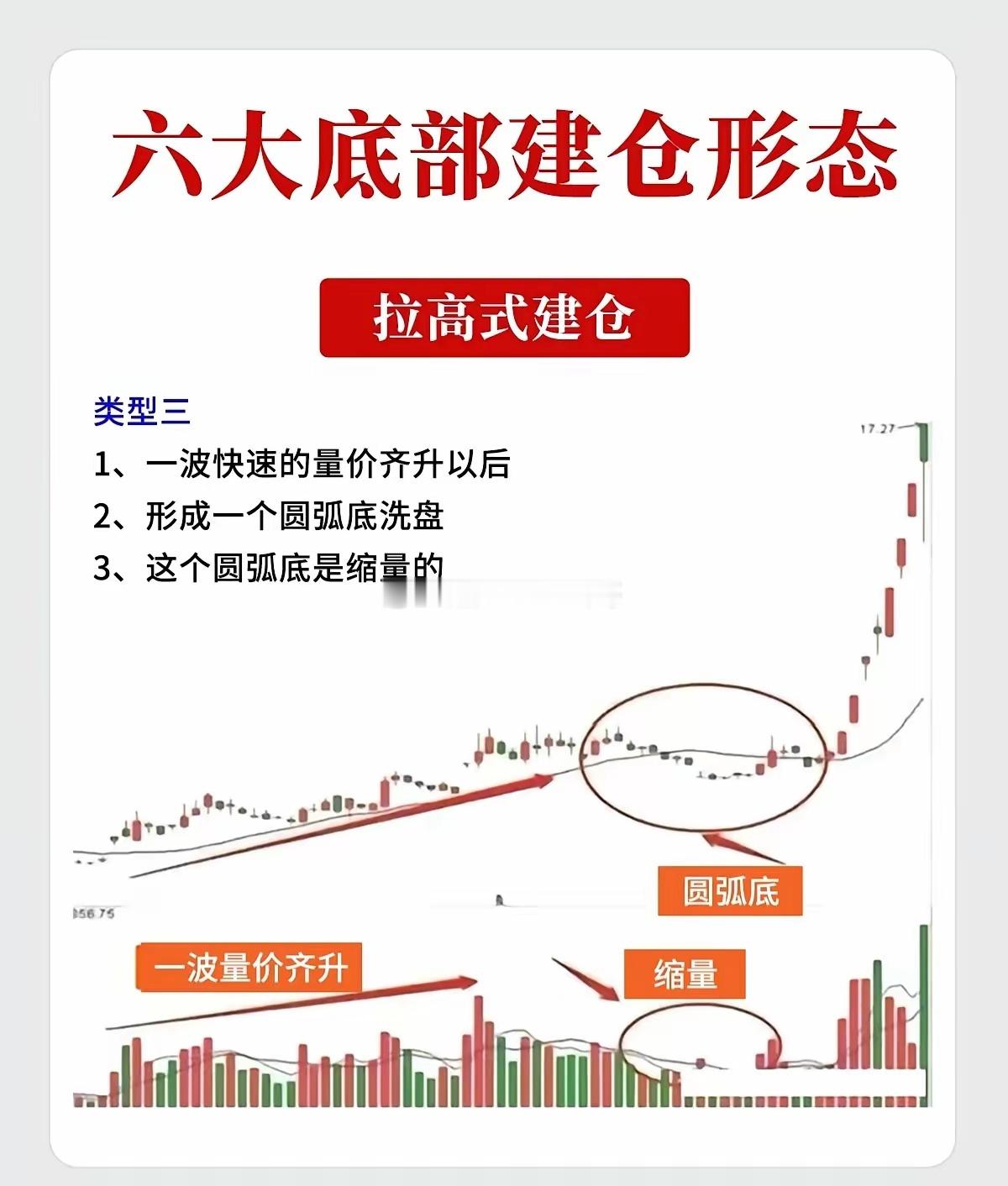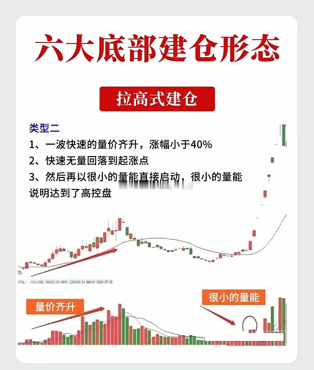 这六种形态是技术分析中关于主力资金在底部吸筹的经典图表模型。一、 横盘式建仓形态特征:股价在底部区域长时间窄幅波动,迫使不坚定的筹码离场,主力暗中吸纳。类型一:深V洗盘型* 形态特征: 1. 长期磨底:存在一个持续时间长达3个月以上的矩形横盘区间,股价波动极小。 2. 暴力洗盘:在正式突破启动前,主力往往会制造一次故意破位的假象(即“深V”杀跌),随后迅速被买盘拉回,以此彻底清洗恐慌盘。类型二:过顶放量型* 形态特征: 1. 箱体震荡:股价整体在极小的空间内(如20%-30%的振幅)进行长时间横盘。 2. 直接启动:当股价向上突破前期高点时,伴随成交量的显著放大(量超前量),形成大阳线继续上攻,这通常是行情直接启动的信号。类型三:突破回踩型* 形态特征: 1. 突破前高:经过超过3个月的横盘后,股价首次放量突破前期高点。 2. 缩量回抽:突破后,股价通常不会直线拉升,而是会再次缩量回调至前高附近支撑位止跌。 3. 介入时机:当股价在支撑位企稳,再次放量向上攻击时,是最佳的出手点。二、 拉高式建仓形态特征:主力不甘于漫长等待,通过快速拉升股价吸引市场眼球,在上涨过程中完成吸筹。类型一:阶梯式建仓* 形态特征: 1. 量价齐升:初期一波明显的上涨伴随着放量,回调时则明显缩量,体现健康的吸筹节奏。 2. 涨幅控制:这一波拉升的幅度通常不宜过大(一般控制在40%以内),以免过度抬高建仓成本。 3. 中途蓄势:一波拉升后开始回调,但往往会在这一波涨幅的50%位置止跌企稳。 4. 确认信号:随后出现一根放量并突破前期高点的阳线,标志着建仓结束,主升浪开启。类型二:无量诱多型* 形态特征: 1. 快速拉高:出现一波快速的、短时间的量价齐升,涨幅同样小于40%。 2. 急速回落:随后股价快速无量回落,甚至跌回至起涨点附近,给人一种“行情结束”的错觉。 3. 控盘启动:当主力吸筹完毕,再次启动时,往往只需要很小的量能就能推动股价上涨,这说明筹码已经高度集中(达到了高控盘状态)。类型三:圆弧底洗盘型* 形态特征: 1. 首轮拉升:先有一波快速的、明显的量价齐升。 2. 圆弧洗盘:随后股价进入长时间的横盘整理,形成一个平滑的圆弧底形态。 3. 缩量筑底:在这个圆弧底构筑的过程中,成交量极度萎缩,说明抛压已尽,主力控盘度极高。免责声明:以上内容仅为技术分析理论的总结与图表形态解读,不构成任何具体的投资建议。股市有风险,投资需谨慎。