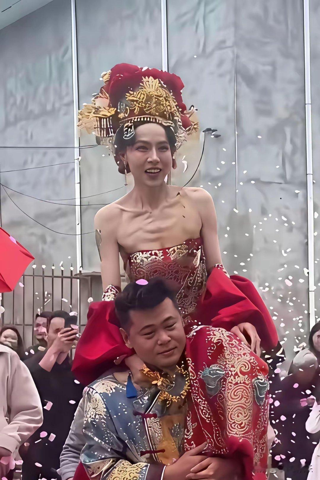 新郎半膝跪在新娘面前接她走。新娘却语出惊人,你要是能学三声狗叫我就跟你走。新郎尴