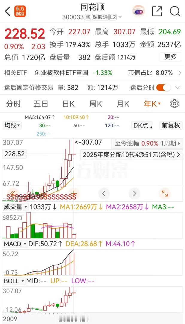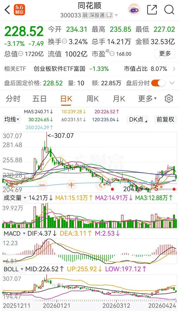 同花顺周五同样也是低开跳水后在低位横盘,收盘时跌了3.17% ,报价228.52元。在资金流向上,连续四天被主力资金净卖出,本周的合计净卖出金额约为9.5587亿元。从走势上看,连续两天的持续杀跌,暂时已经破坏了之前的上涨结构。在业绩方面,一季报显示,公司实现营业总收入10.53亿元,同比增长了40.81%;归母净利润2.56亿元,同比增长112.58%;扣非净利润2.5亿元,同比增长122.58%。