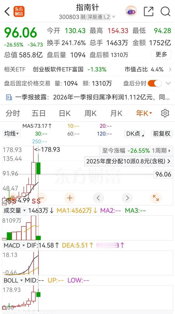 东方财富、指南针和同花顺三只在创业板交易的券商概念股,在2026年表现各异,截止