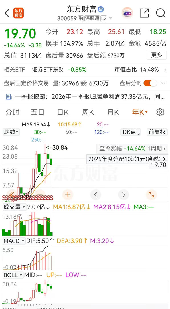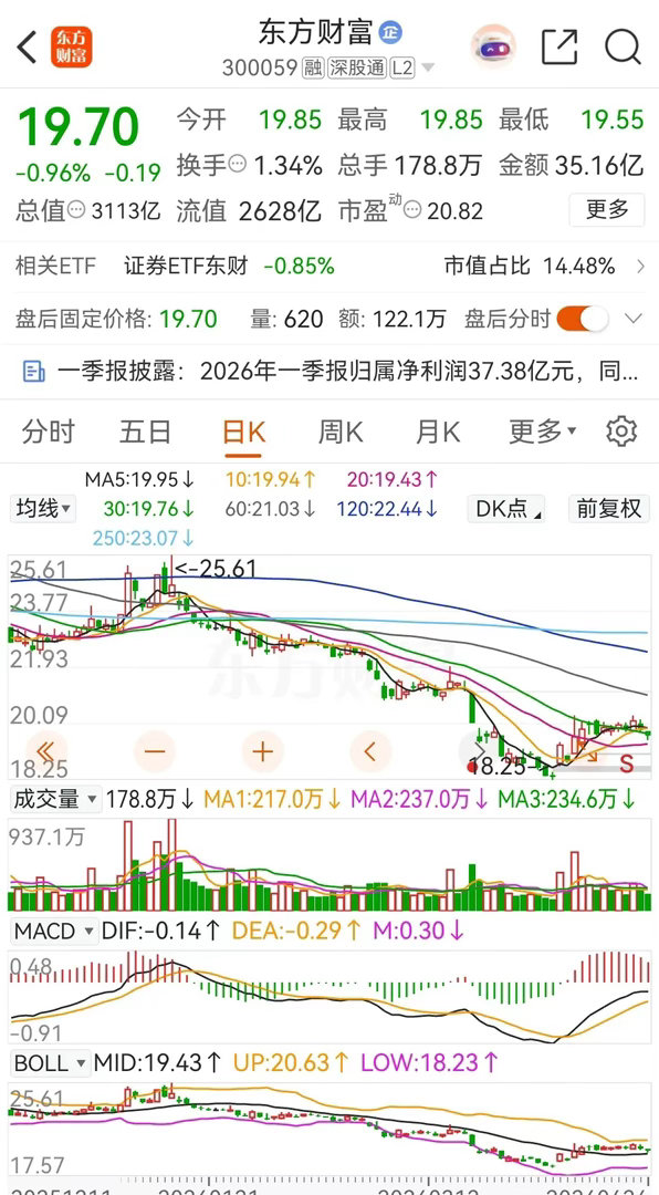 东方财富周五低开跳水后低位横盘,收盘时下跌了0.96%,报价19.70元。在资金流向上,本周被主力资金合计净卖出了约13亿元。从走势上看,目前正处于低位放量大涨后的回踩确认阶段。在业绩方面,一季报显示,公司实现营业收入50.31亿元,同比增长44.34% ;归属于上市公司股东的净利润37.38亿元,上年同期的净利润为27.15亿元,同比增长37.67%。