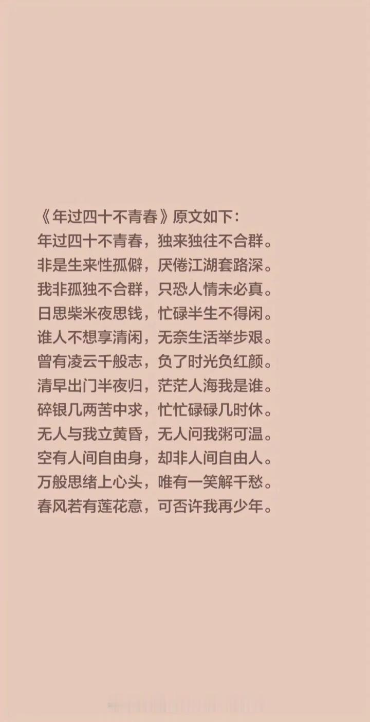 年过四十不青春,独来独往不合群。非是生来性孤僻,厌倦江湖套路深。我非孤独不合群,只恐人情未必真。日思柴米夜思钱,忙碌半生不得闲。谁人不想享清闲,无奈生活举步艰。曾有凌云千般志,负了时光负红颜。清早出门半夜归,茫茫人海我是谁。碎银几两苦中求,忙忙碌碌几时休。无人与我立黄昏,无人问我粥可温。空有人间自由身,却非人间自由人。万般思绪上心头,唯有一笑解干愁。春风若有莲花意,可否许我再少年。
