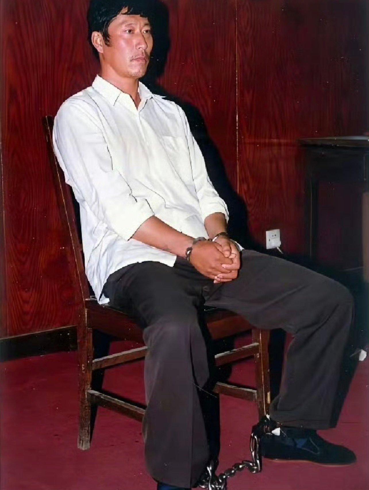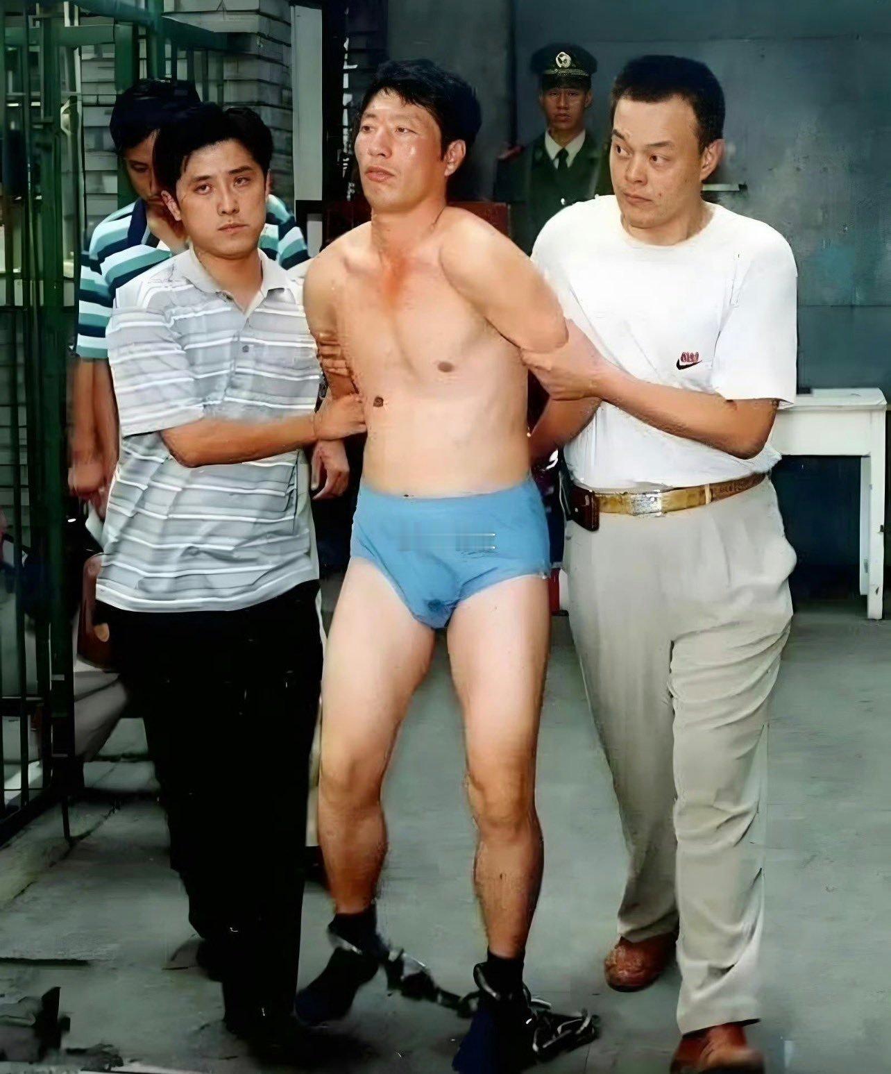 1997年,“悍匪”白宝山被警方控制的现场。他穿条裤衩,双手反铐,脚上有镣铐。