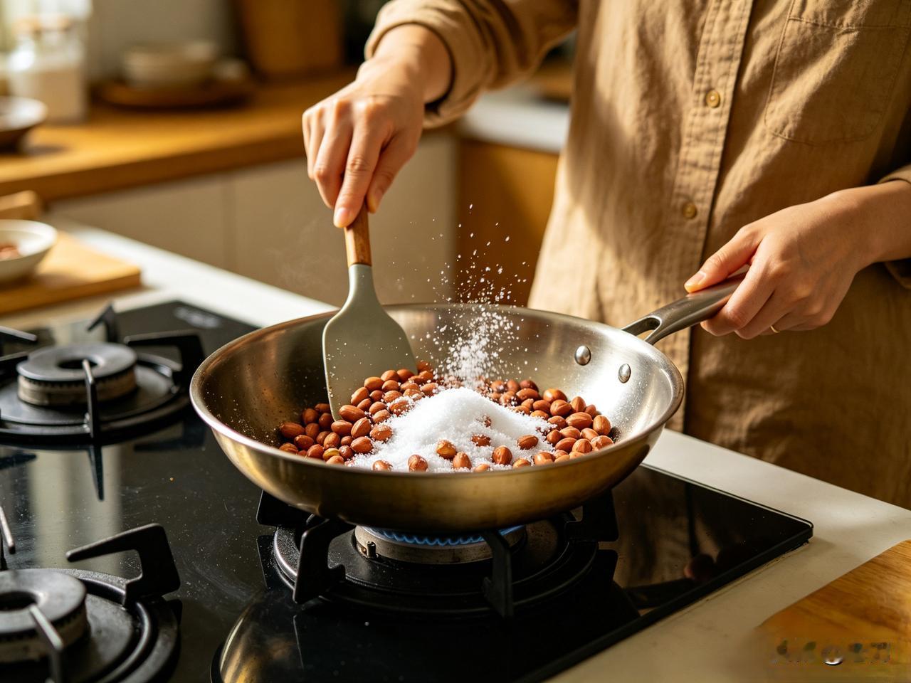 特意拿出从玉林带回来的两袋海盐,想着用盐炒出来的花生更香更入味,先把海盐倒进锅里小火炒热,紧接着把花生米倒进去,拿着锅铲认认真真反复翻炒。
