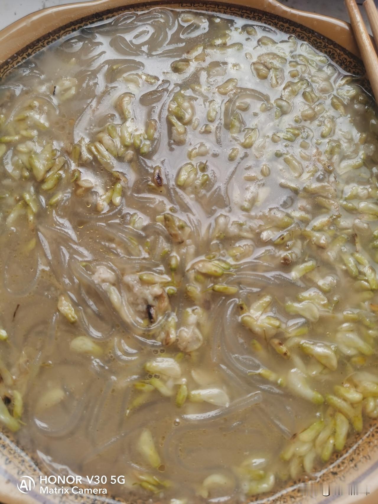 今天中午顺路回家看看,没提前和母亲打好招呼,看到我回家,本来已经做好饭的母亲又特意给我烧了一碗槐花粉条汤。
