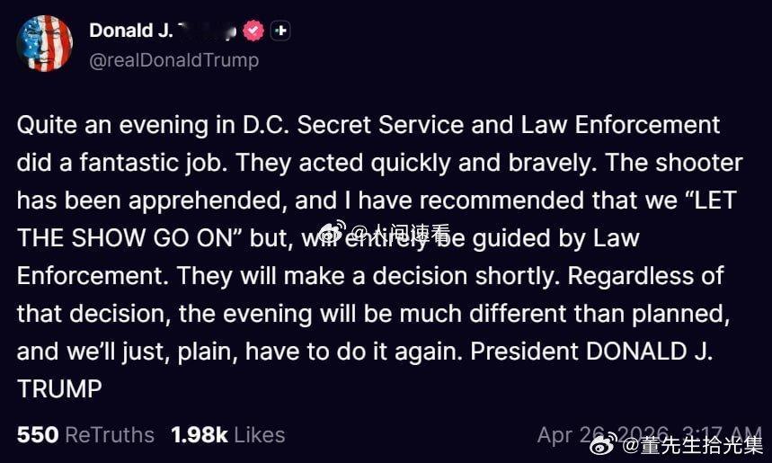 白宫晚宴枪手赤裸上身被按在地上晚宴惊魂一瞬:枪响之下反应反差尽显危机,特朗普屡遇威胁感叹从政之险当地时间4月25日,华盛顿希尔顿酒店举办的白宫记者协会晚宴突发枪击险情,一声巨响打破高端政务晚宴的平和氛围。嫌疑人携带霰弹枪、刀具等多类武器强闯安检关卡、现场开火,特朗普、第一夫人梅拉尼娅、副总统万斯、国务卿鲁比奥等一众政坛高层紧急疏散撤离。这场有惊无险的安全事件,不仅暴露美国高层安保隐患,夫妻二人临场反应的鲜明反差、以及特朗普事后感慨,更折射出当下美国政坛日益严峻的人身安全困境与政治焦虑。枪响瞬间反应迥异,危机感知高下立现事发现场最具话题性的细节,莫过于特朗普夫妇面对突发异响的截然不同判断。特朗普事后公开回忆,巨响传来的第一时间,他并未察觉危险,下意识误以为只是餐盘滑落、托盘坠地的普通意外声响,对潜在风险毫无预判。反观第一夫人梅拉尼娅,危机感知极为敏锐。在旁人尚且恍惚、会场尚未大面积慌乱之时,她第一时间辨别出异响绝非日常动静,迅速判断遭遇危险并立刻做出躲避避险动作。特朗普也坦然坦言,正是看到妻子快速避险的反应,自己才猛然醒悟、意识到现场已经发生突发安全事件。细微反应之差,直观体现出二人对危险信号的敏感度与临场应变能力差异。本次袭击并未冲入主宴会厅,枪手在距离活动区约50米处被特勤局当场制服。整场事件无人出现致命伤亡,仅有一名特勤局特工近距离中弹,依靠防弹衣防护幸免于难,事后送医检查。即便风险没有直面降临主席台,骤然响起的枪声、强行闯关的袭击者,依旧让整场高端晚宴陷入慌乱,两千余名宾客慌忙掩体躲避,现场秩序瞬间崩塌。特朗普夫人反应迅速