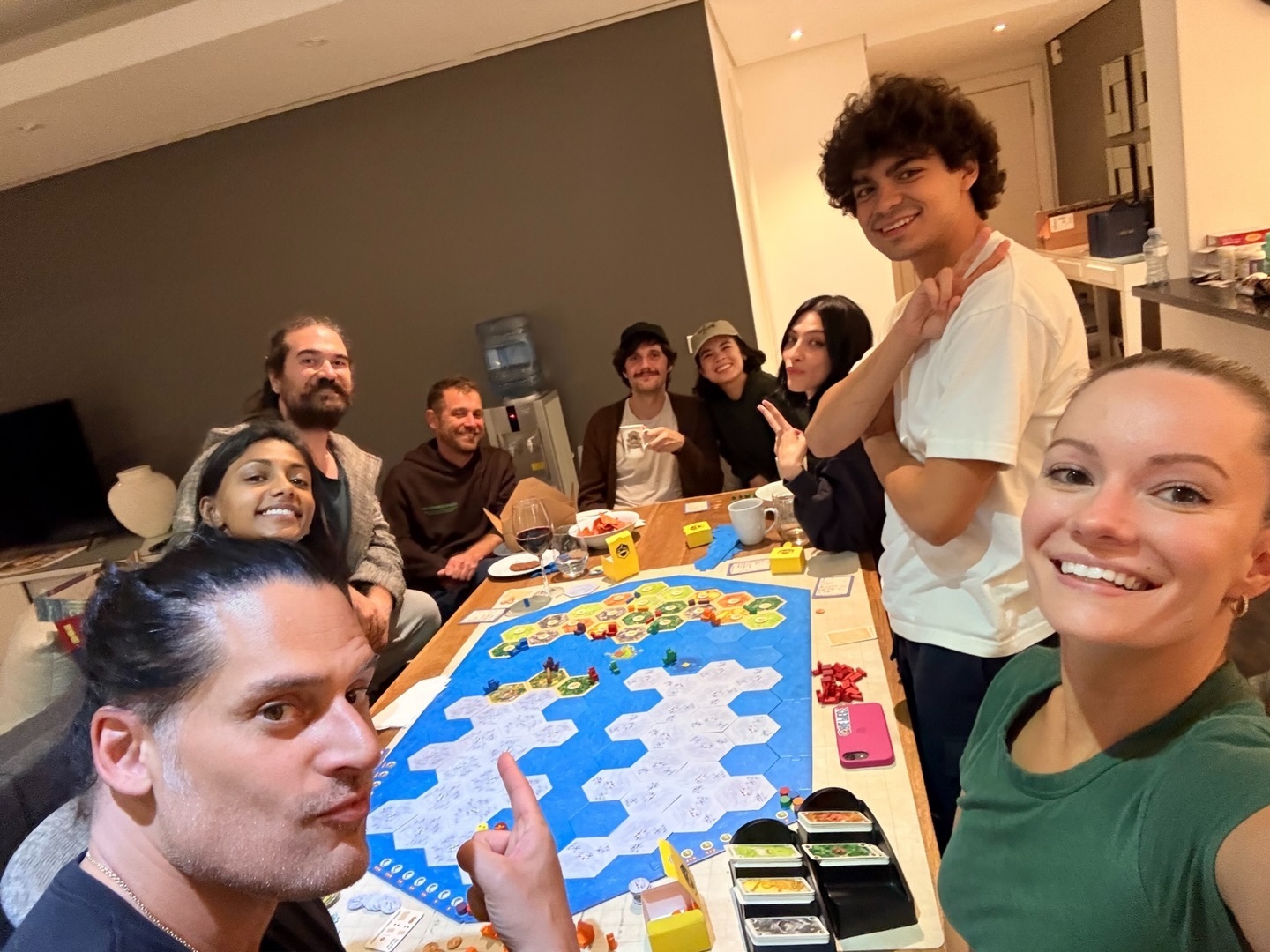 海贼王真人剧第三季剧组路飞、薇薇、罗宾、沙鳄鱼演员等人一起玩卡坦海盗桌游。海贼王真人剧海贼王真人版