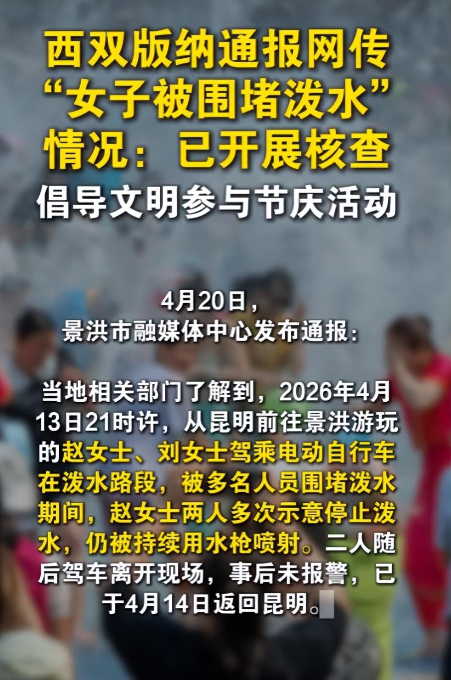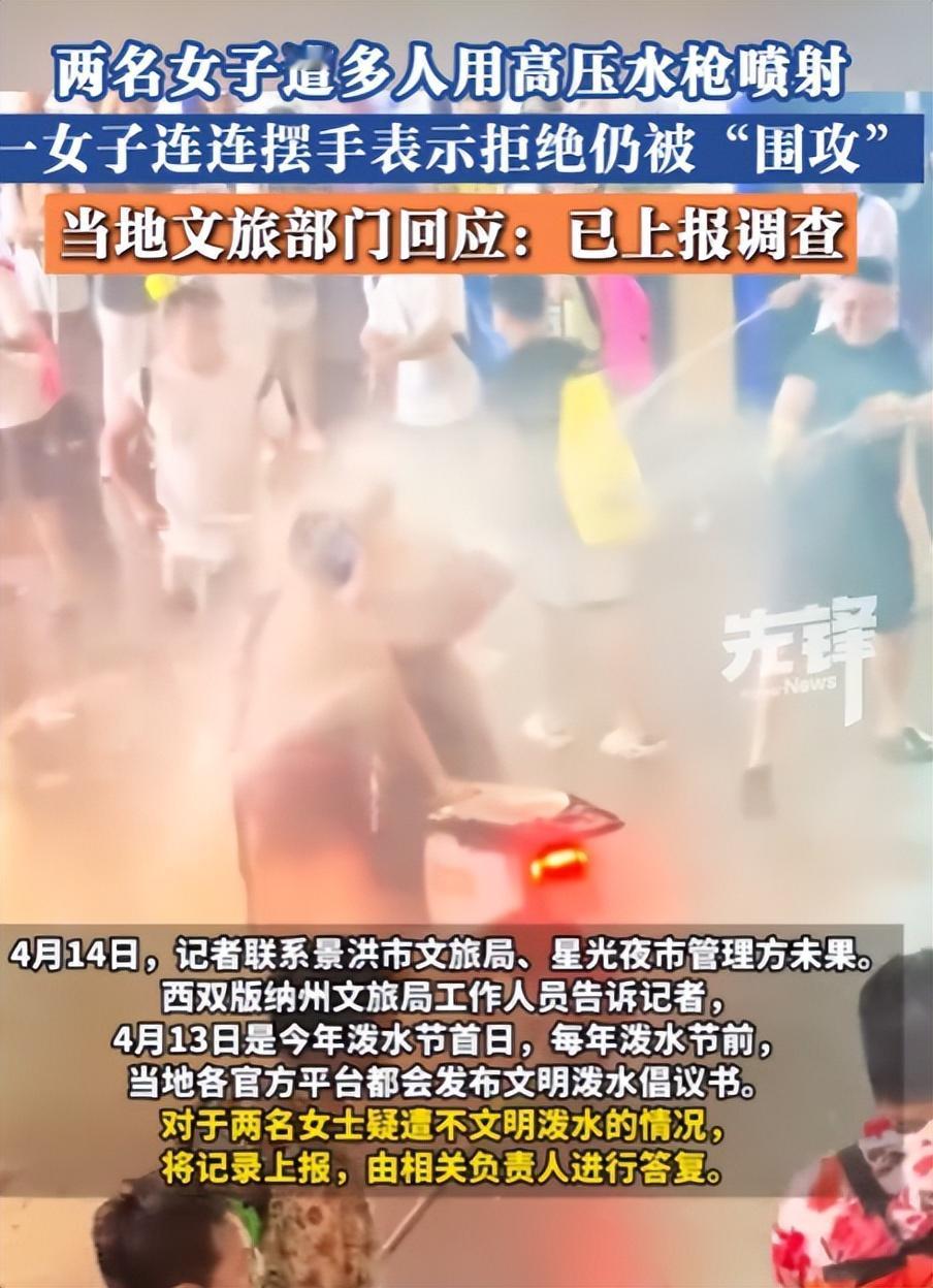 4月13日,西双版纳,两个穿红裙子的女孩骑电动车路过,被几个男的用高压水枪劈头盖脸地喷,不是喷脸,是往隐私部位喷。女孩尖叫求救,围上来的人越来越多,笑声越来越大。