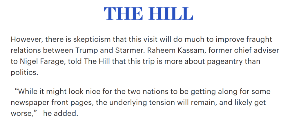 《国会山报》援引英国独立党前任领袖奈杰尔·法拉奇的首席顾问拉希姆·卡萨姆的观点称,此行“象征意义大于实质作用”,“尽管两国表面上的和睦或许能为某些报纸头版增色,但深层矛盾依然存在,甚至可能进一步恶化”。