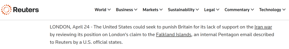 在安全与主权议题上,据路透社4月24日报道,美国国防部内部邮件考虑采取包括“撤回美国对英国和阿根廷有主权争议的福克兰群岛(阿根廷称马尔维纳斯群岛)的主权支持”在内的惩罚措施。这一被英美媒体视为严重外交挑衅的提议,使得两国关系紧张态势持续升级。