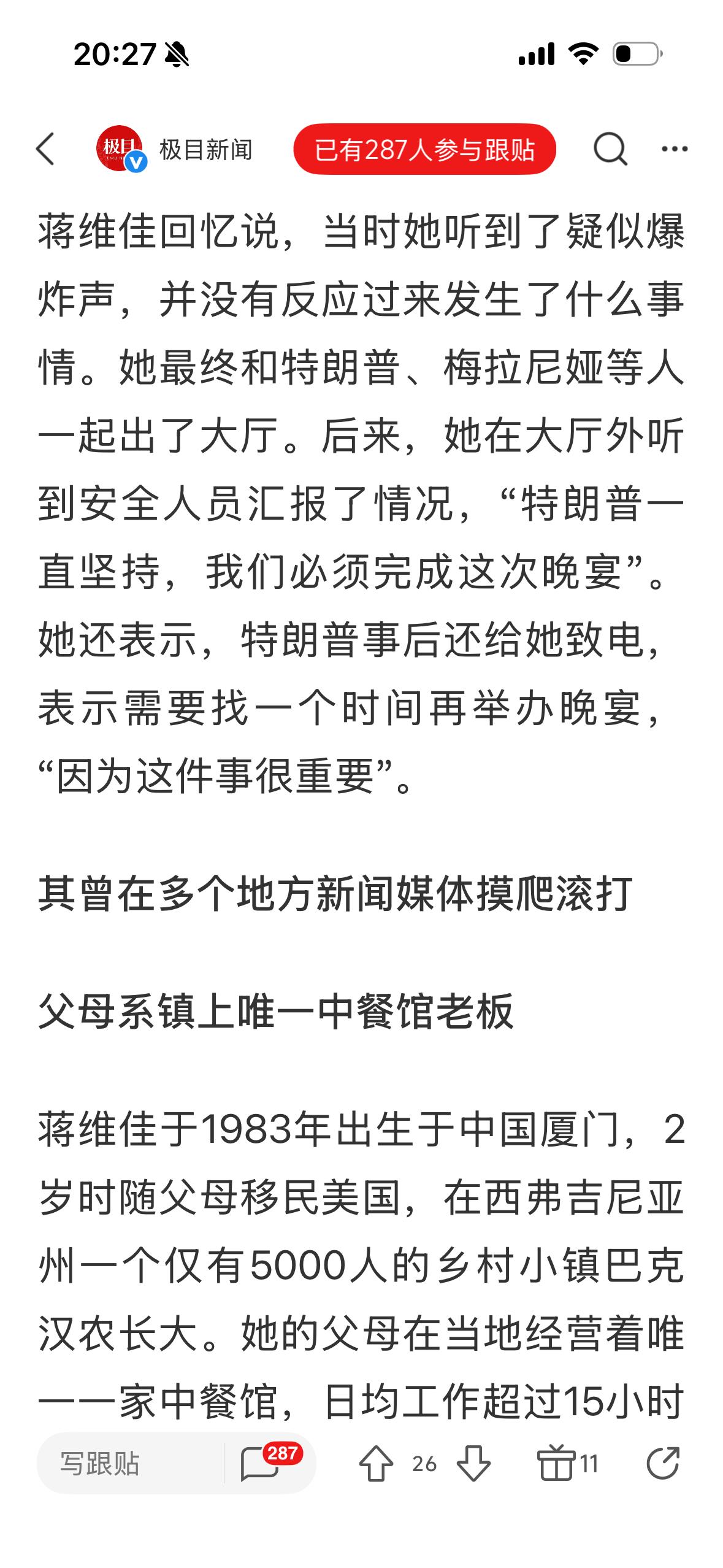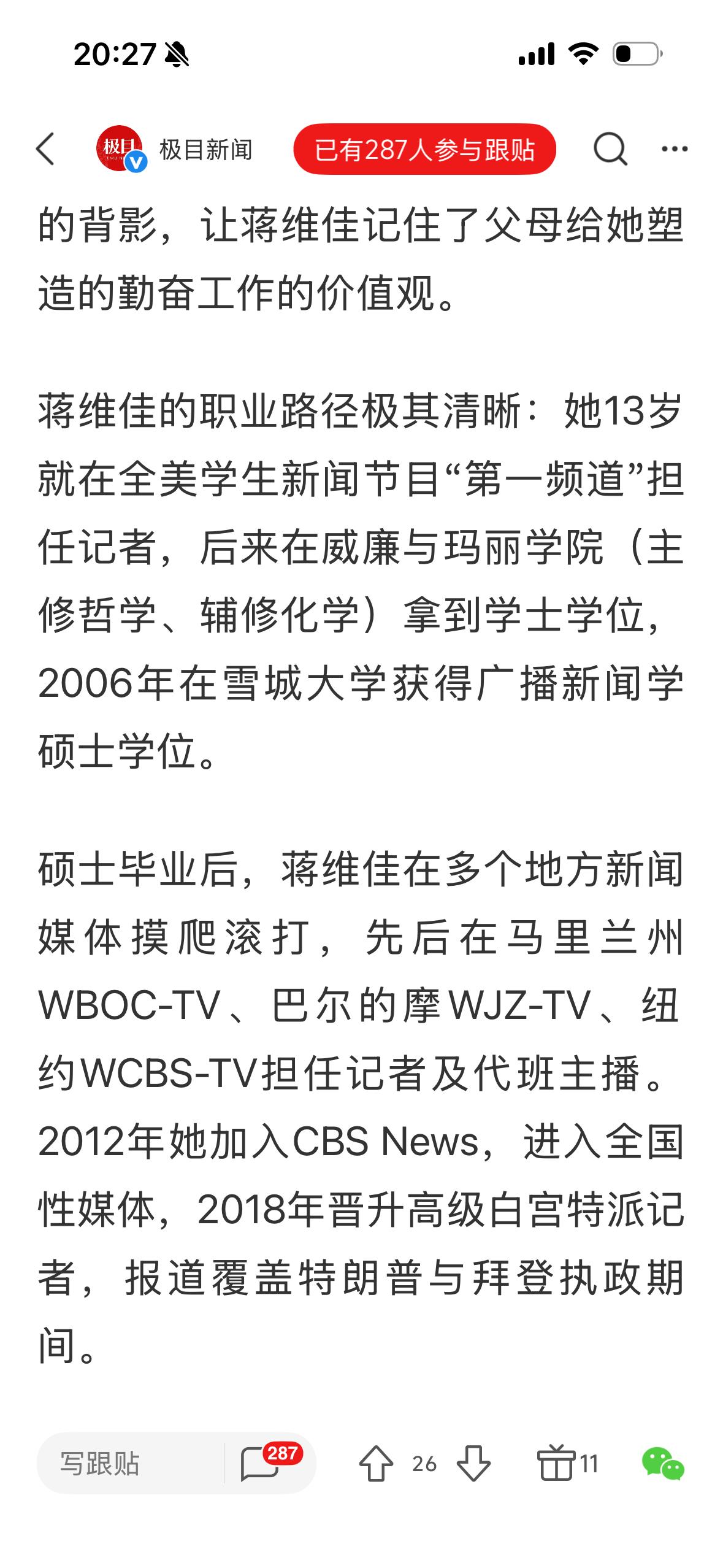 蒋维嘉,1983年出生于福建厦门,2岁时随父母移民美国;她是白宫记者协会史上首
