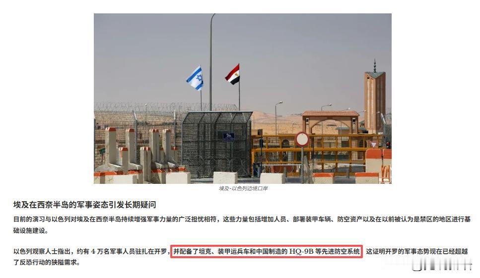 据亚洲防务安全报道,4月26日-4月30日,埃及在西奈半岛距离埃以边境100米处集结部队,举行大规模实弹演习。有观察人士指出,似乎有中国HQ-9B防空系统被发现。