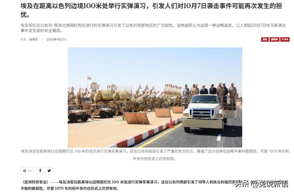 据亚洲防务安全报道,4月26日-4月30日,埃及在西奈半岛距离埃以边境100米处