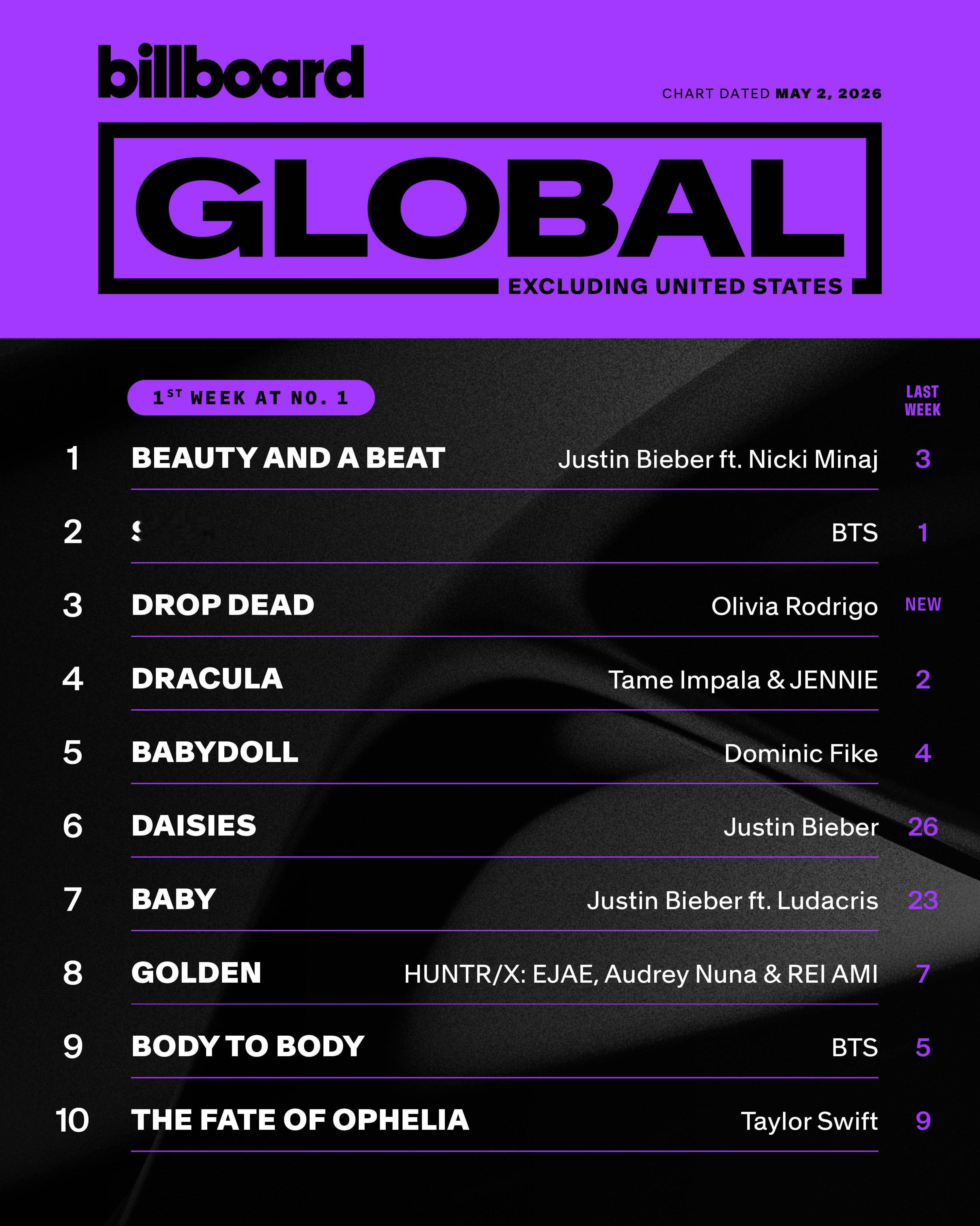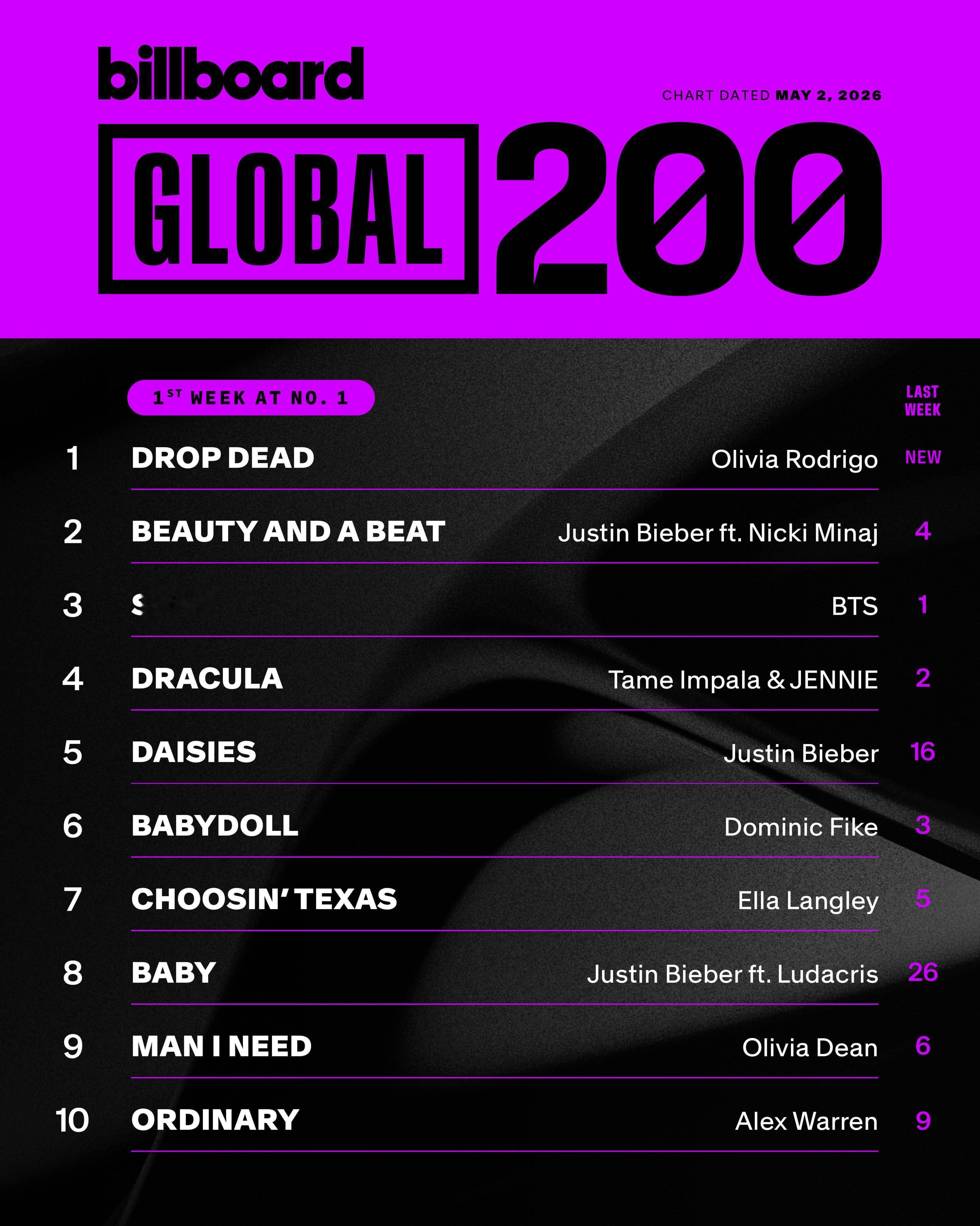 • Billboard Global 200全球单曲榜: 1️⃣. drop dead - Olivia Rodrigo (new)