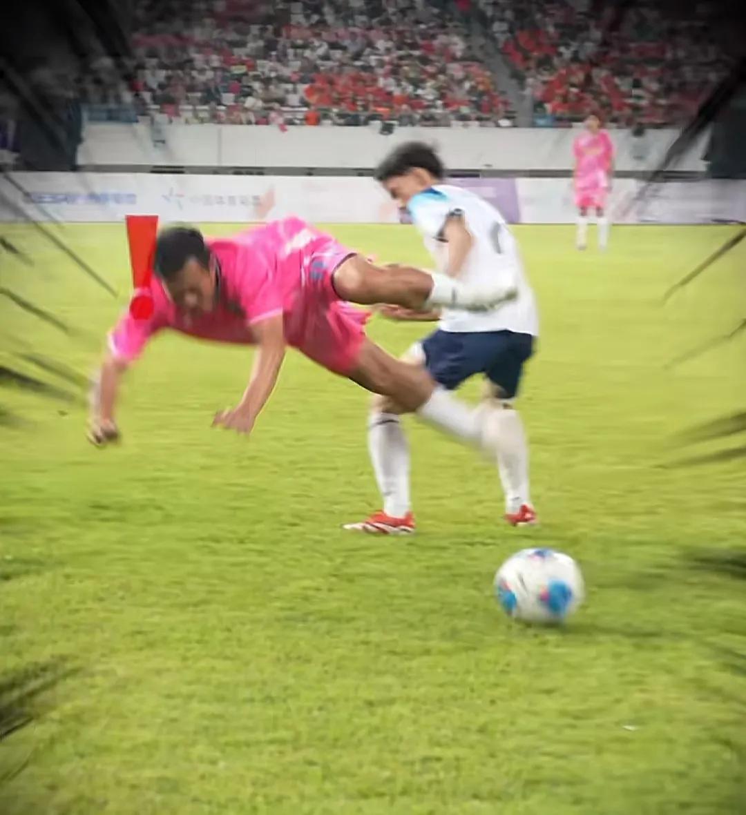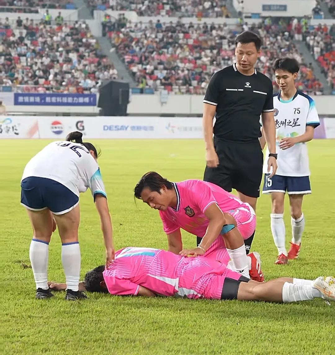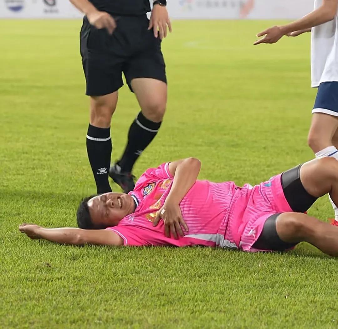期间,他被年轻小伙子绊倒,当场直挺挺摔在草地上。只见他紧捂着胸口趴在地上缓了很长时间,才勉强慢慢爬起来,看得出来他摔得不轻。一众队友以及对手都担心不已,纷纷上前看他。