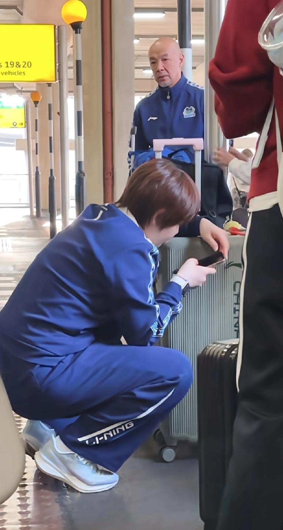 一路推着行李,脸上一直挂着笑眯眯的表情,像揣着小零食出门春游的小朋友,连脖子上挂着的白色耳机都跟着透着软萌劲儿。候机时直接蹲在行李箱旁边低头刷手机,圆乎乎的脸蛋埋着,乖得像个偷跑出来玩的小屁孩,完全没有距离感,谁看了不喊一句“太可爱了”!