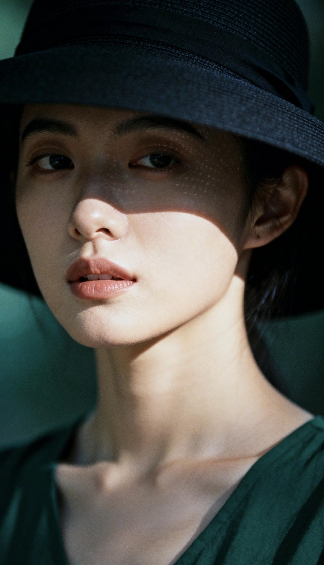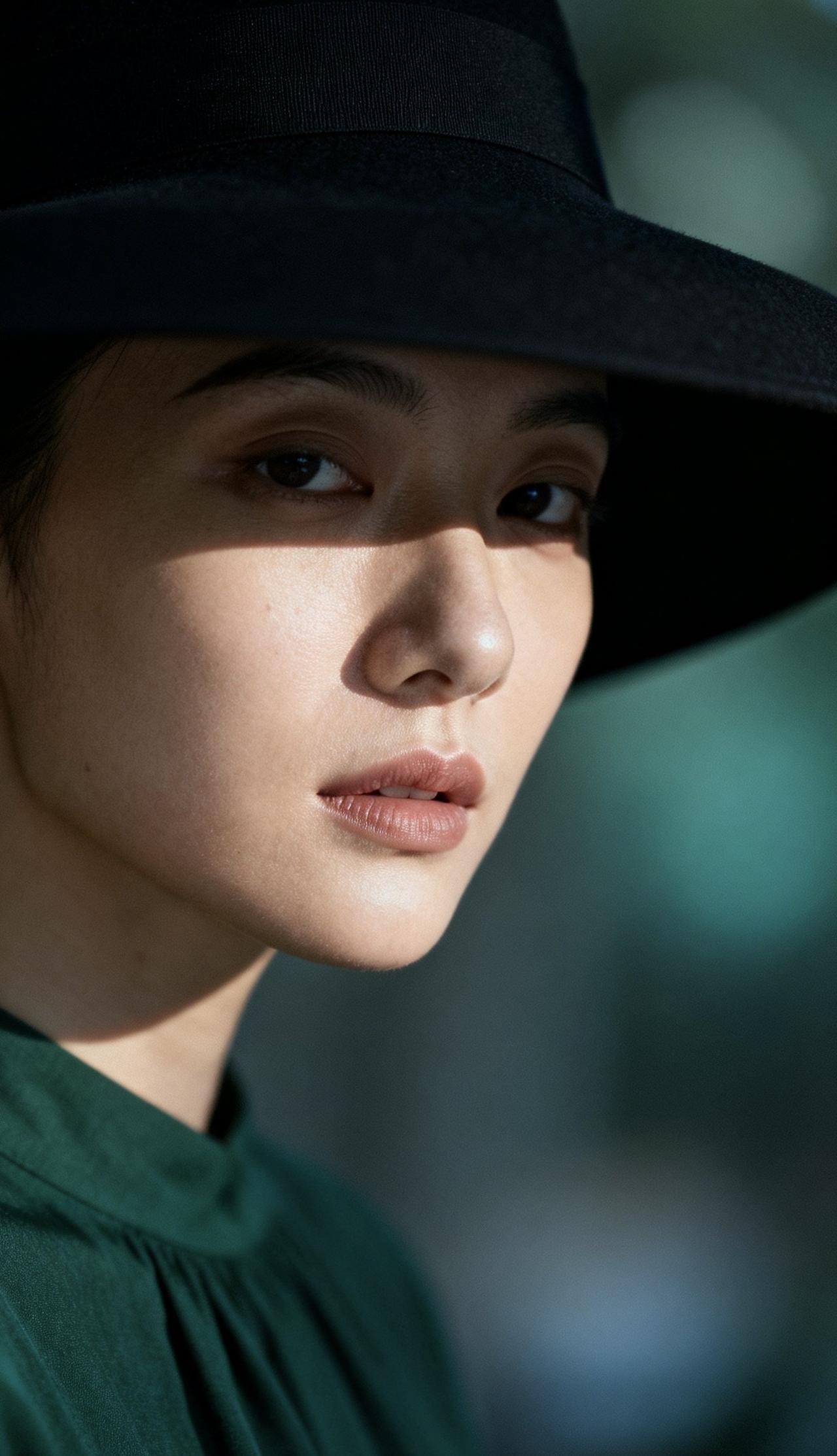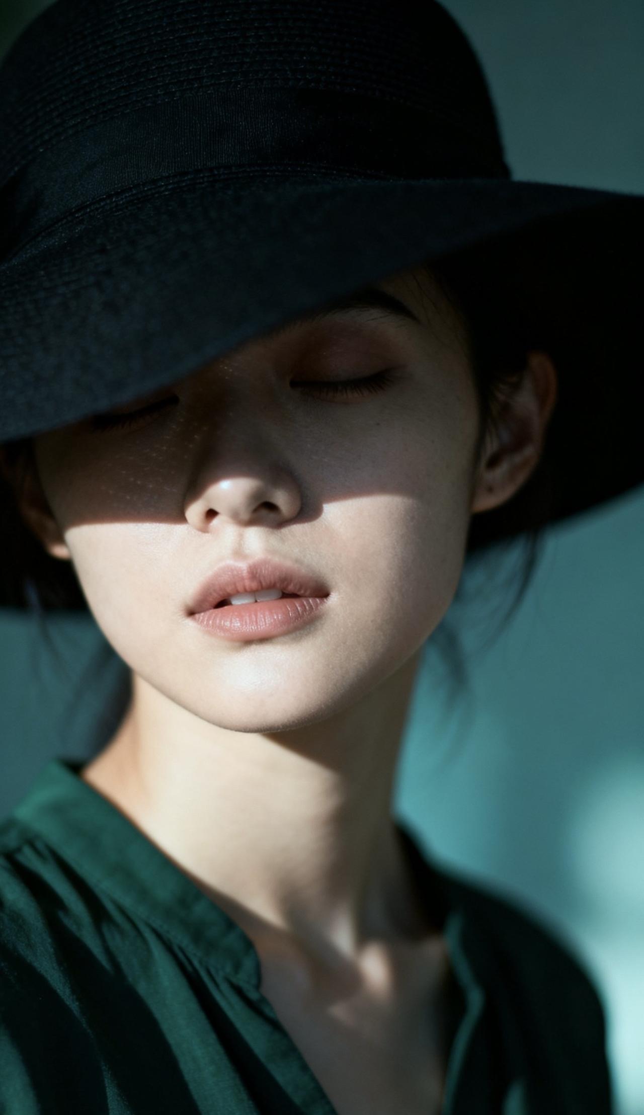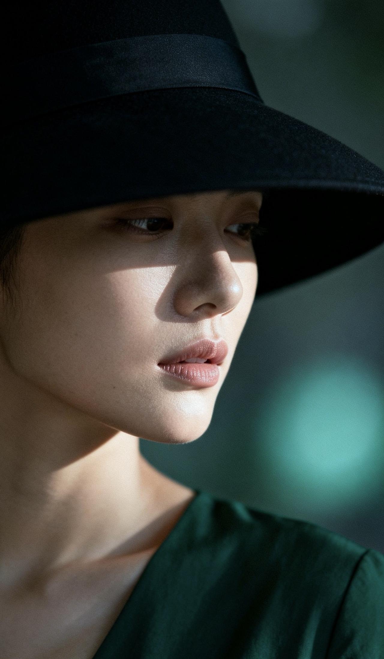 📝特写镜头聚焦中国年轻女生,戴着黑色宽檐帽,帽檐遮住双眼,自带神秘感。身着深绿上衣,画面是暗沉复古调性,明暗光影反差浓烈,用伦勃朗光勾勒身形轮廓。整体色调柔和高级,偏莫兰迪质感,柔焦效果温柔细腻,大光圈虚化背景,氛围感拉满。