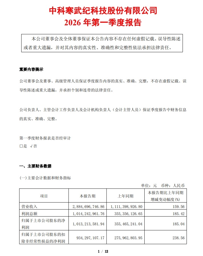 【寒武纪:一季度净利10.13亿元 同比增长185% 环比增长122%】寒武纪公告,2026年第一季度实现营业收入28.85亿元,同比增长159.56%;归属于上市公司股东的净利润为10.13亿元,同比增长185.04%。业绩变动主要系报告期内受益于人工智能行业算力需求的持续攀升,公司凭借产品的优异竞争力持续拓展市场,积极推动人工智能应用场景落地,报告期内收入较上年同期大幅增长所致。注:公司Q1净利润10.13亿,2025年Q4净利润4.55亿,据此计算,Q1净利润环比增长122%。