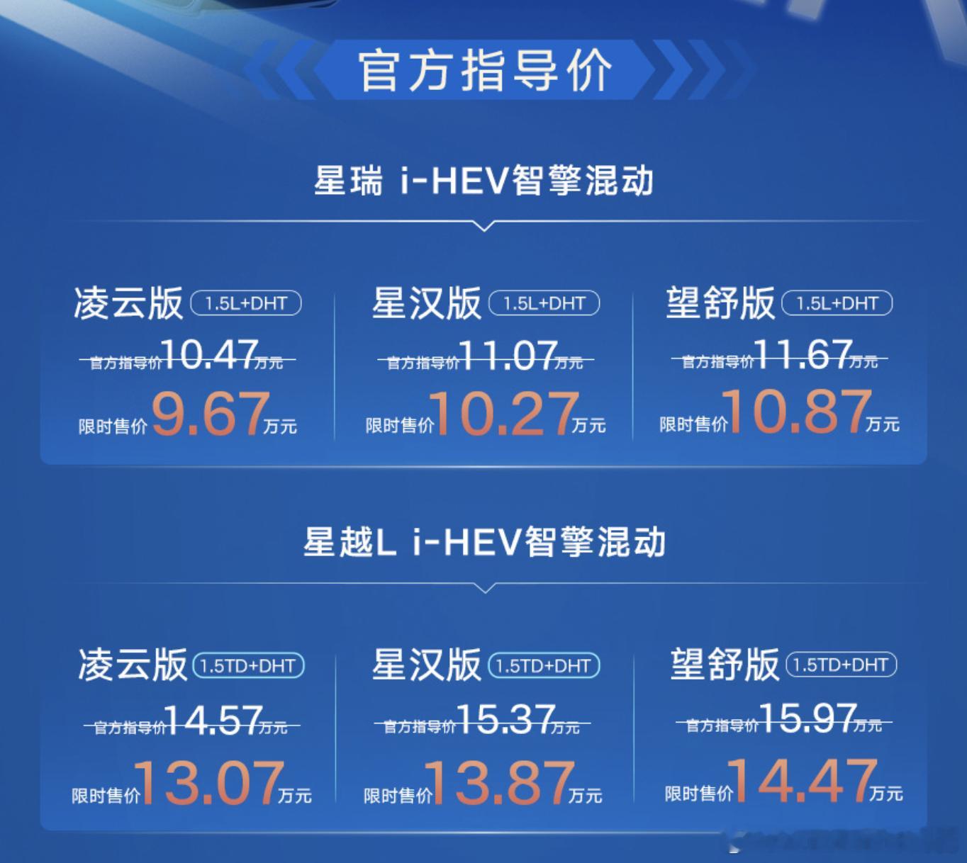 其中星越 L i-HEV售价14.57-15.97万元,星瑞i-HEV售价10.47-11.67 万元