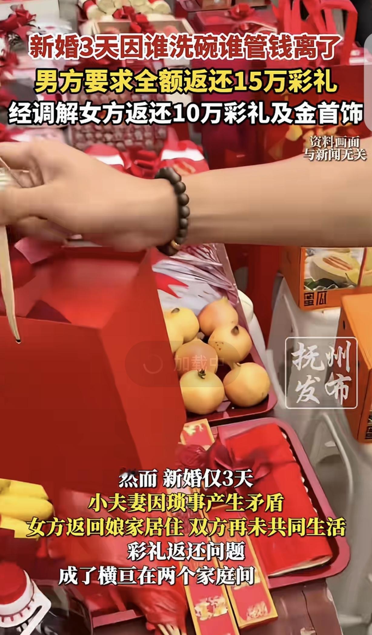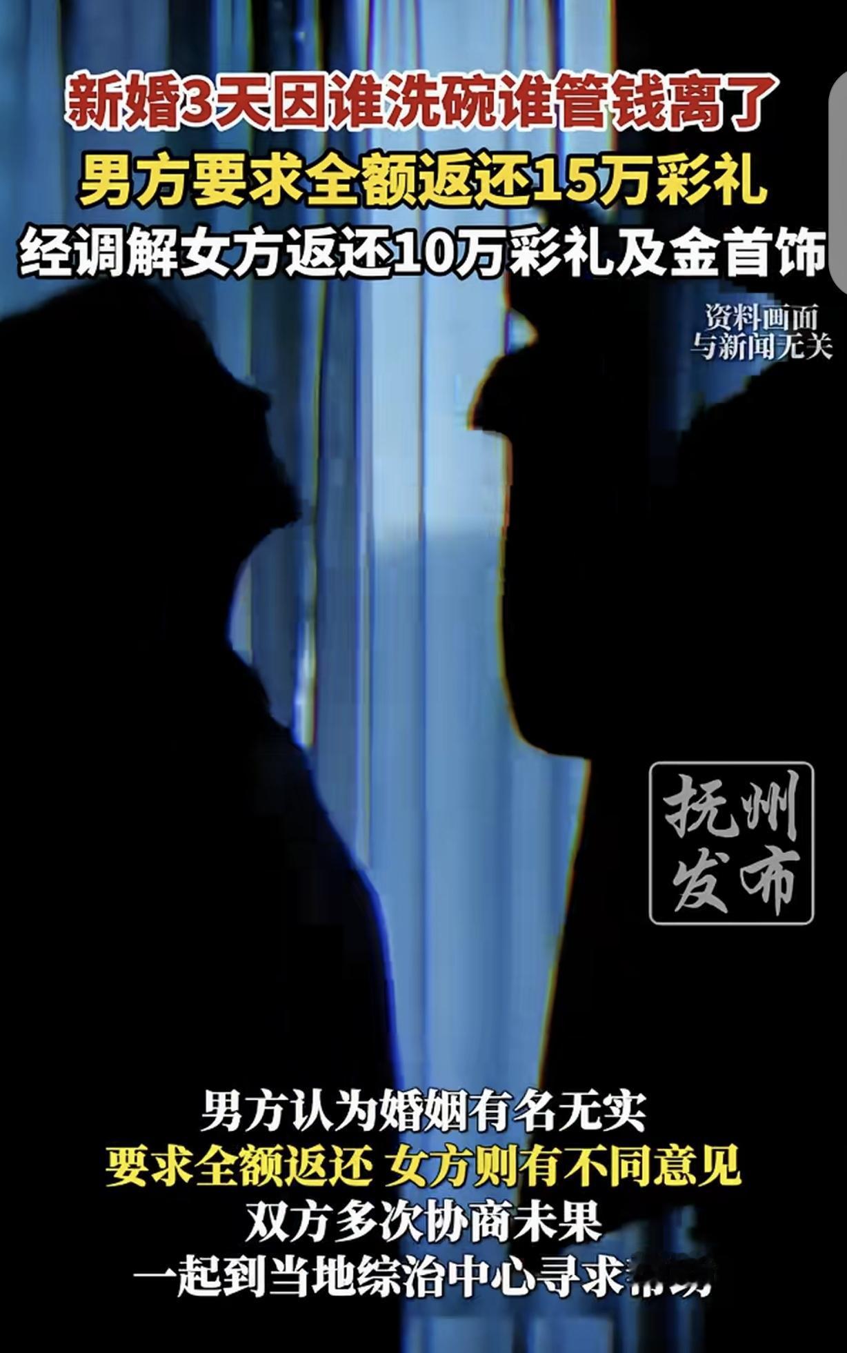 “3天挣5万!”新疆,一女子结婚,婚后才3天,她和丈夫就因为谁洗碗?谁管钱?闹得不可开交,女子跑回娘家,不跟丈夫过了,丈夫怒了,要求女子离婚可以,必须返还15万彩礼,但经过调解,女子只返还10万彩礼和金银首饰。网友:3天挣5万,一年挣500万,做大做强,就能发家致富。
