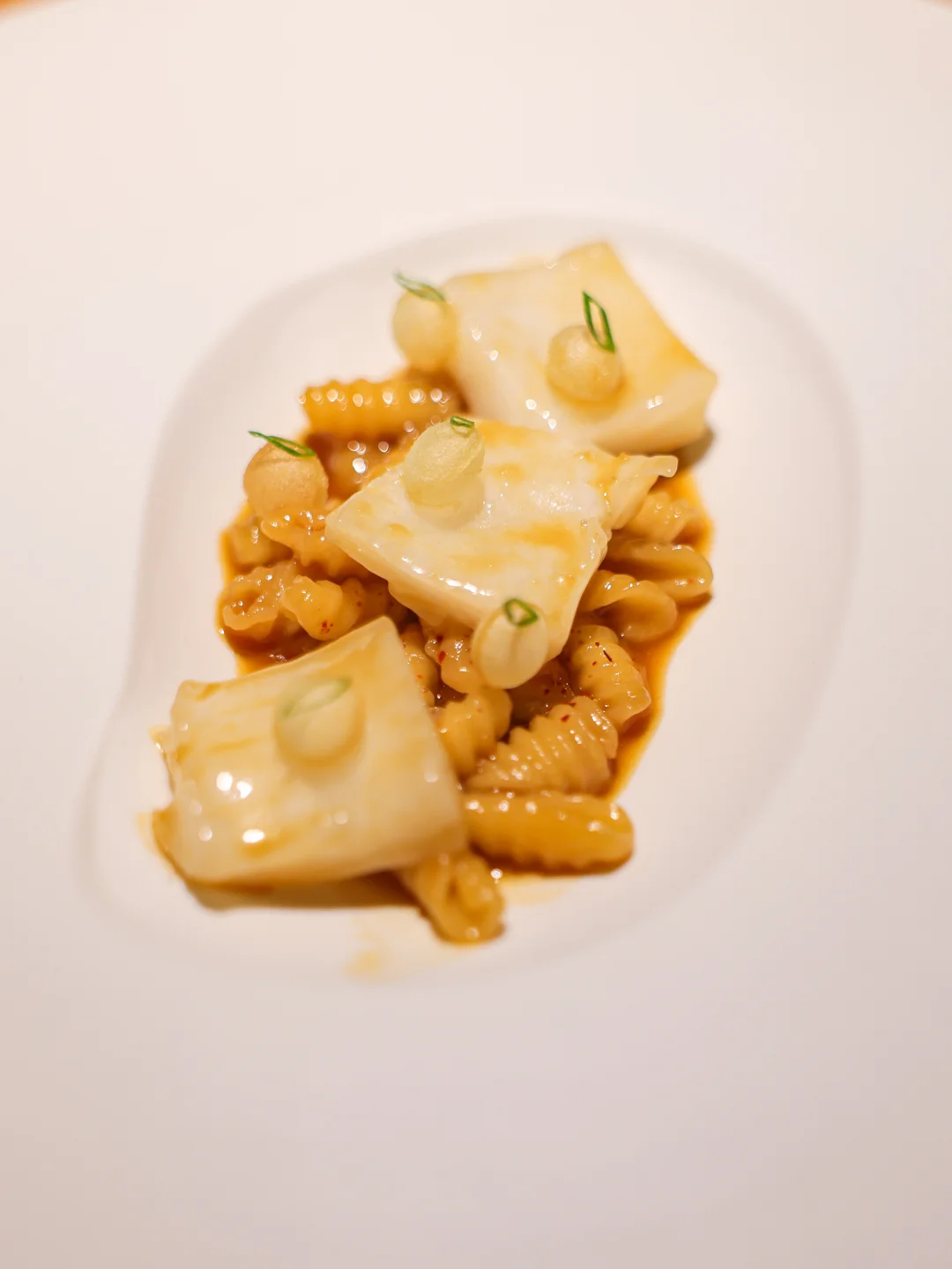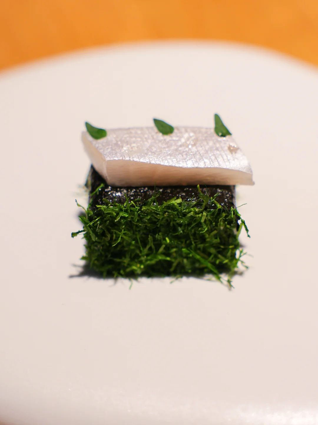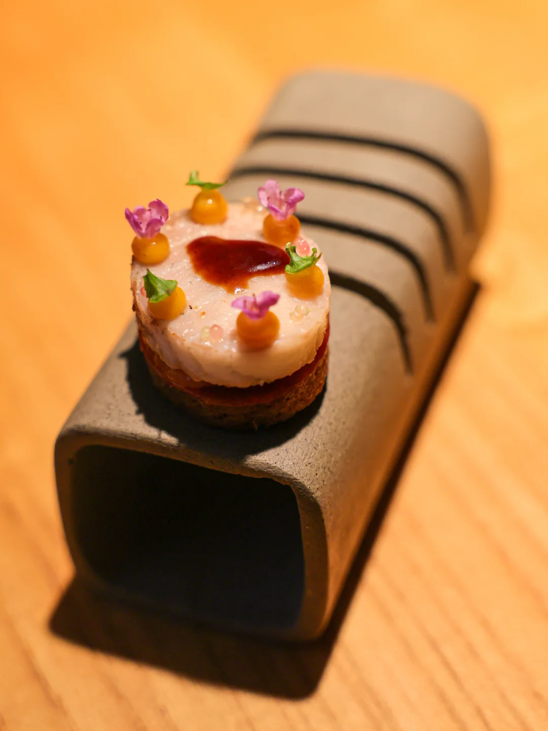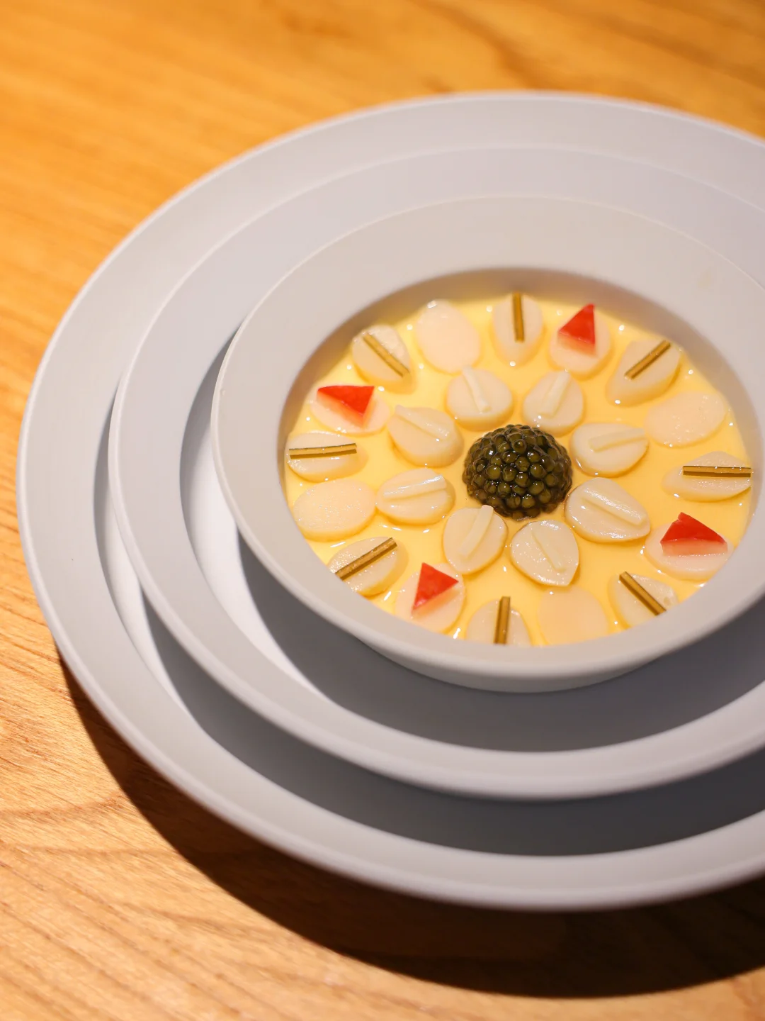 切段的蛏子配上很有张力的摆盘,确实是让人印象深刻;底下的布丁相较之下比蛏子有更突出的鲜味,整体风味依旧比较保守了,但耐不住审美高级,这摆盘谁不爱?