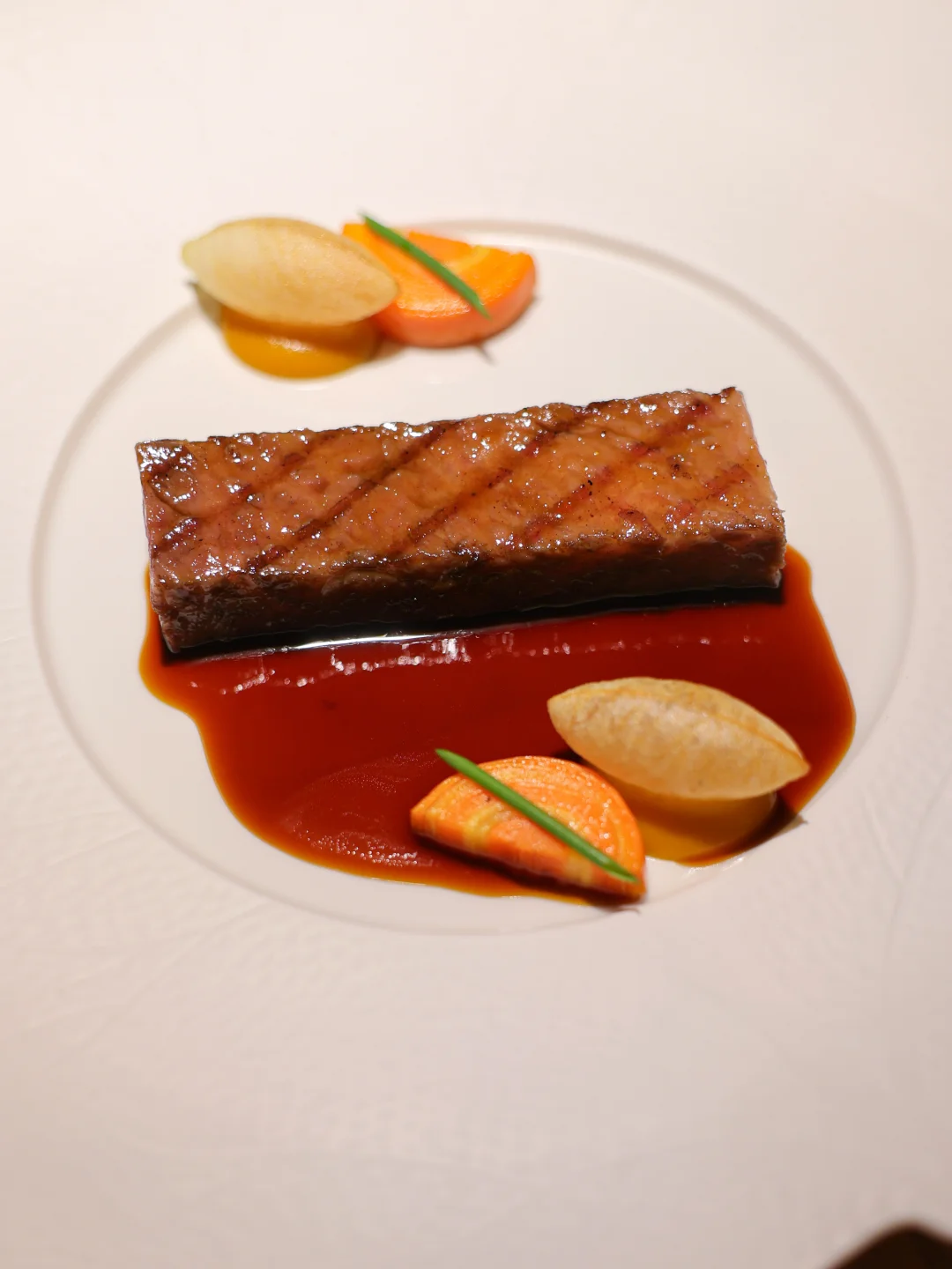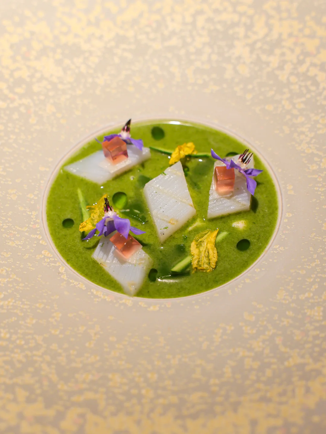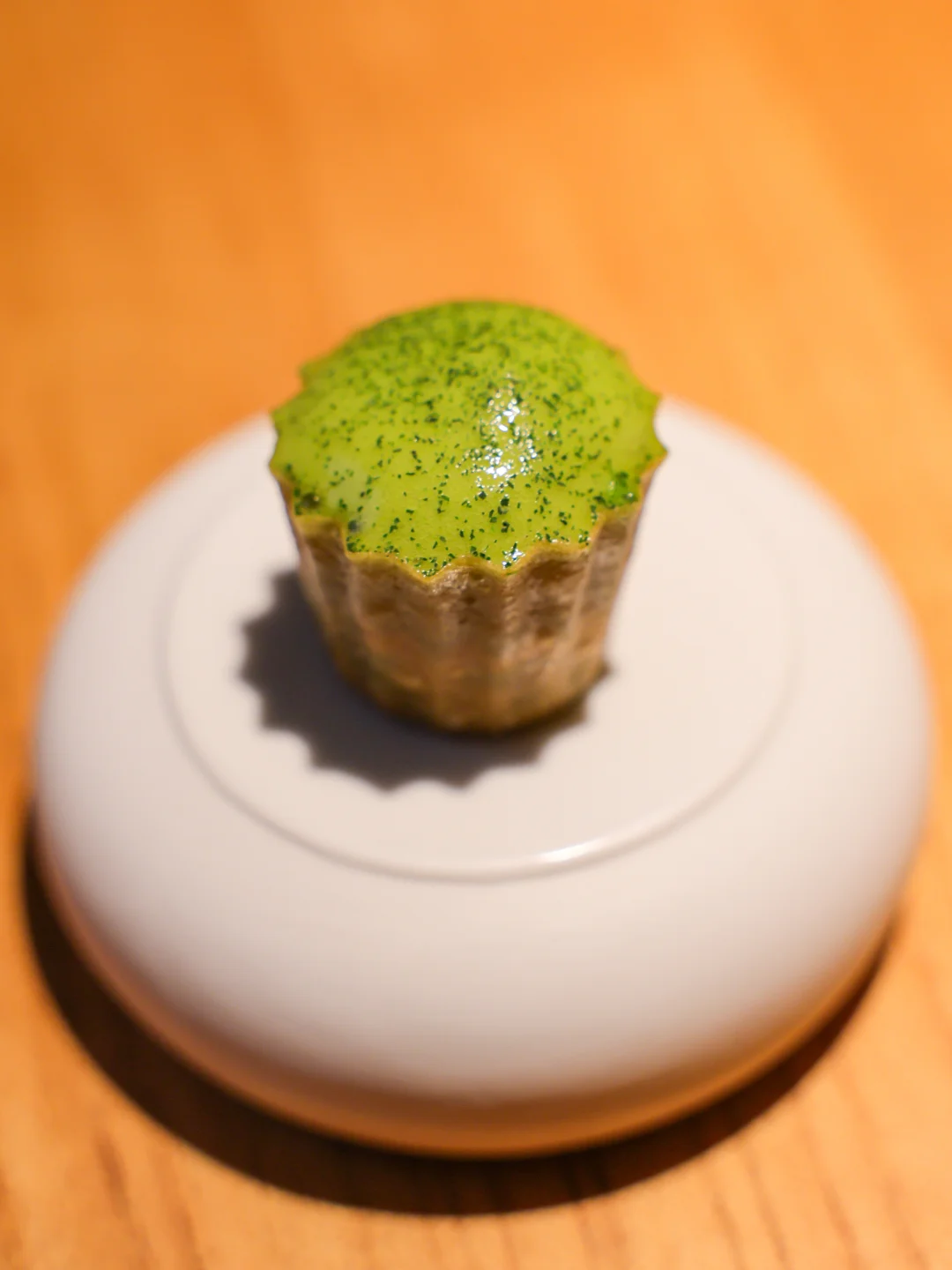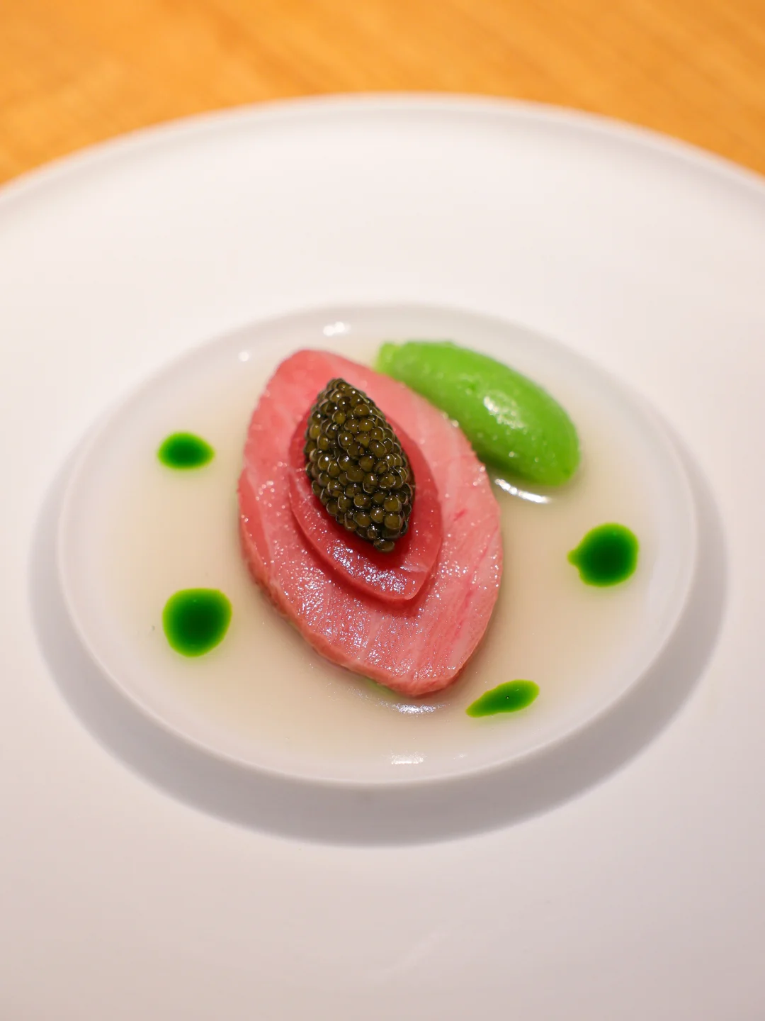切段的蛏子配上很有张力的摆盘,确实是让人印象深刻;底下的布丁相较之下比蛏子有更突出的鲜味,整体风味依旧比较保守了,但耐不住审美高级,这摆盘谁不爱?