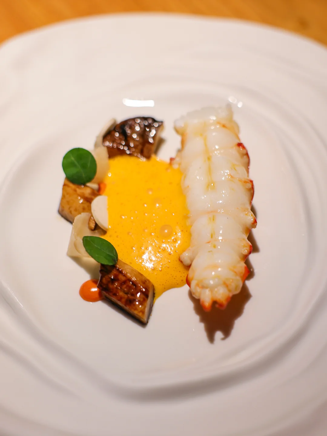 保留溏心的鳌虾混合带菌菇香气的沙巴雍酱汁,太灵了!鲜味一层一层,菌菇的香气又藏在虾鲜味之后,这道好吃的!