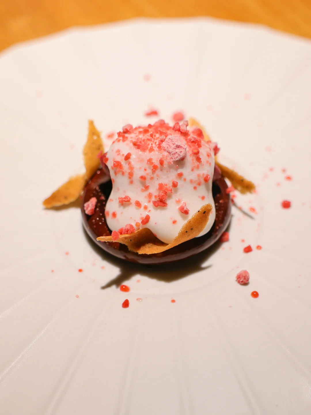 甜品是容易俗套的黑巧为主角,但混合的莓类与糯米泡沫让整体变得十分清新,好吃的。