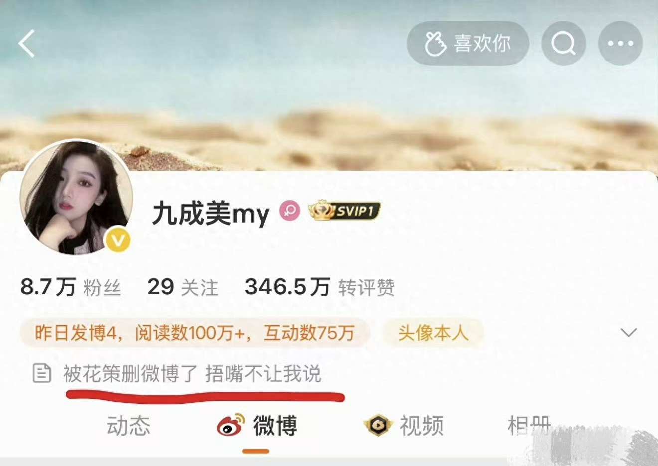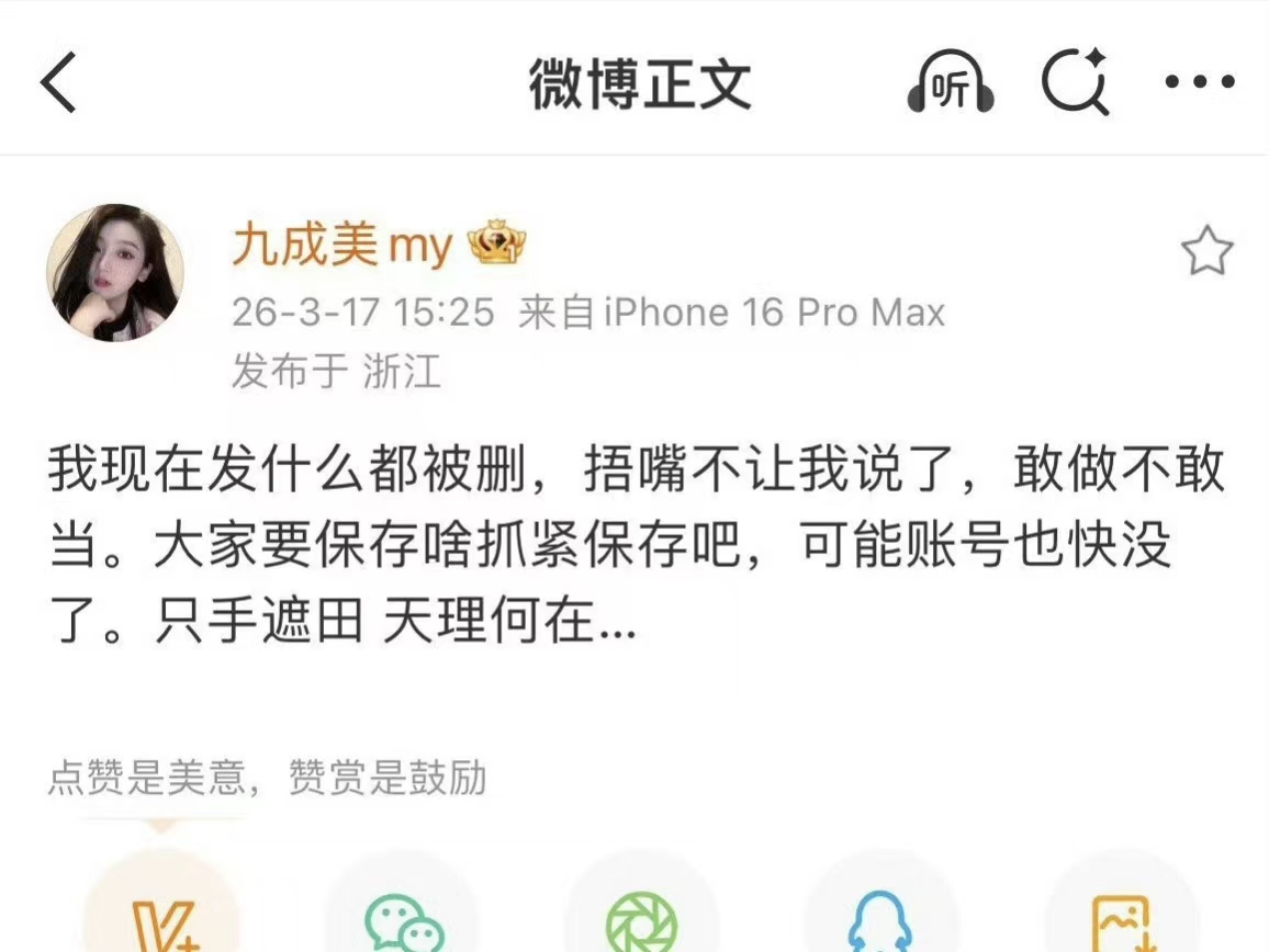 就今天,3月17号,博主“九成美”突然把自己微博简介给改了。新简介就一句话:“被华策删博了,捂嘴不让我说。”这话说得,直接又委屈,一下子就把她和演员田栩宁那档子情感纠纷,又给炸到了台面上。她这意思很明白,就是觉得自己的爆料被男方的经纪公司华策影视给压下去了,不让她说话。
