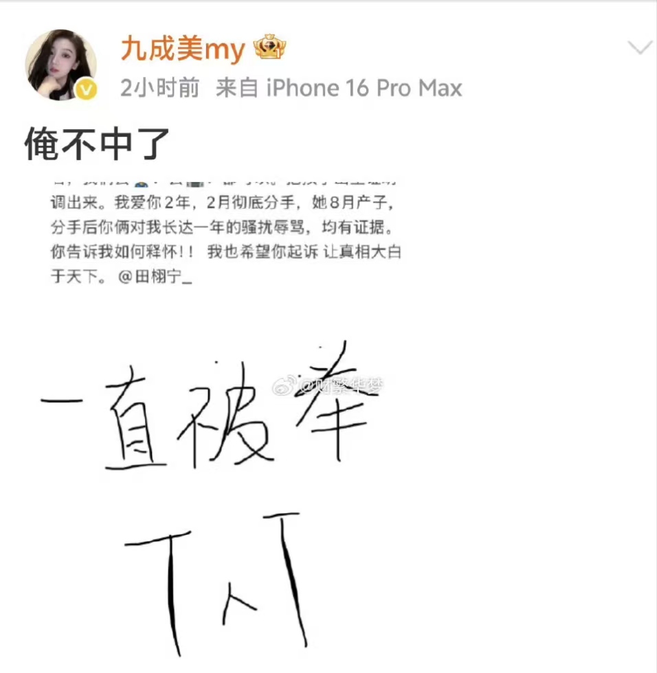 按照九成美的说法,她和田栩宁从2022年初好到2024年1月。恋爱期间,她发现田栩宁出轨了另一个叫“若若”的女生。这还不算完,她说田栩宁和这个若若,其实在2024年8月就已经有了孩子,但一直瞒着她,也瞒着大家。这不就是出轨加隐婚生子吗?信息量巨大。
