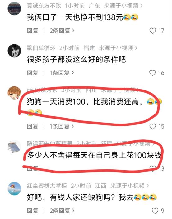还有网友更扎心:“我一个月生活费都花不到3000,结果养宠人倒好,舍得给狗狗花这么多!”