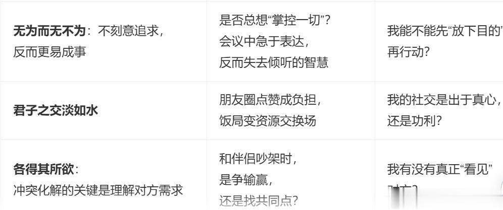 | | 无为而为 | 我是否强求控制?可否顺势而行?(如强行说服、过度干预) | 提醒自己:“放下抓取,反得自在” |