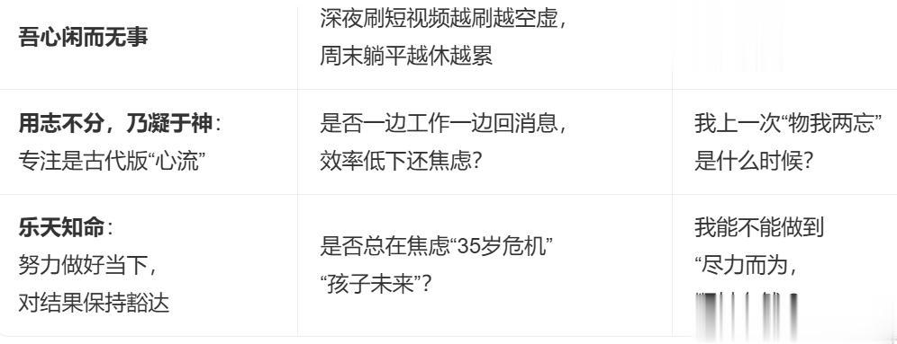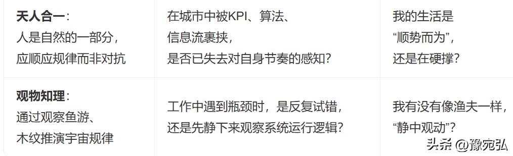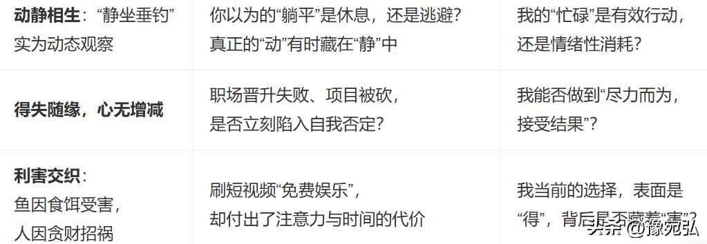 | 工作中 | 动静之衡 | 我是真忙,还是心乱?(行动是否源于清醒判断) | 每小时暂停1分钟,问:“此刻我在‘钓鱼’还是‘扑鱼’?” |