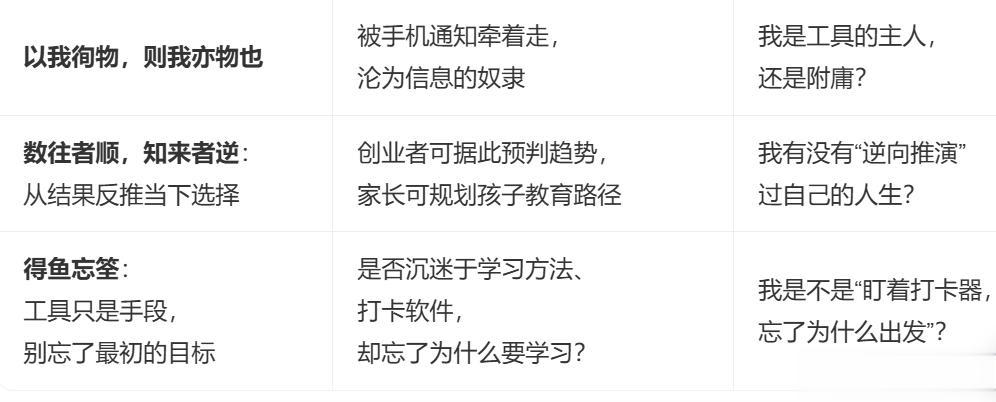 | | 得鱼忘筌 | 我是否沉迷工具,忘了目标?(如打卡、数据、形式主义) | 自问:“我用方法,还是被方法所用?” |