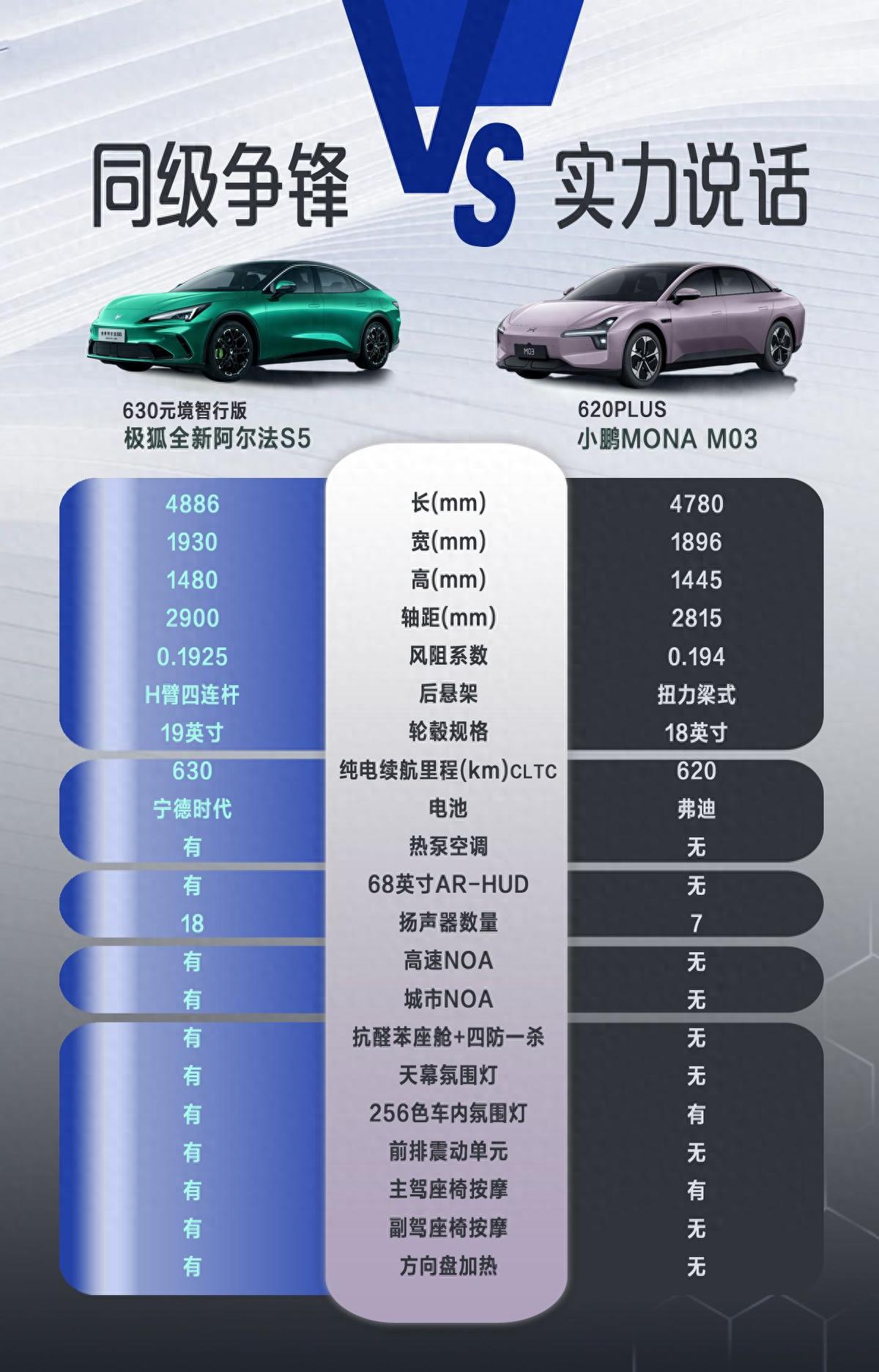 内外配置的小细节,最能看出一款车的用心,极狐全新阿尔法S5的诚意真的很足。外部有感应式后尾门,解放双手超方便,无框车门、电动尾翼还有艳色定钳,把轿跑的运动感拉满,这些配置在小鹏MONA M03上都没有。内部打造了抗醛苯座舱,还配了四防一杀滤芯,守护健康这块很到位,天幕氛围灯、前排震动单元、主副驾座椅按摩、方向盘加热这些配置也都有,坐上去的舒适感直接拉满。小鹏MONA M03只配了主驾座椅按摩和256色车内氛围灯,在舒适配置的丰富度上,就差了点意思。