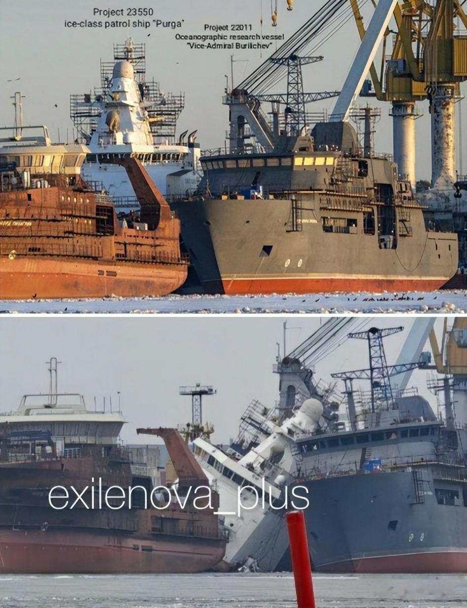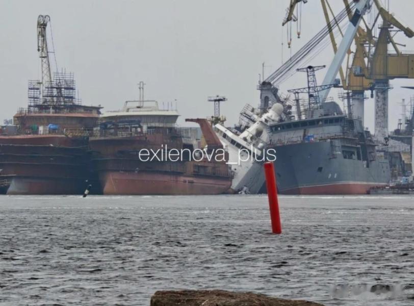 现场画面看得人头皮发麻:停在码头的俄海岸警卫队 “暴风雪” 号极地破冰巡逻舰,被精准命中后舰体严重倾斜,直接坐沉在码头泊位里。