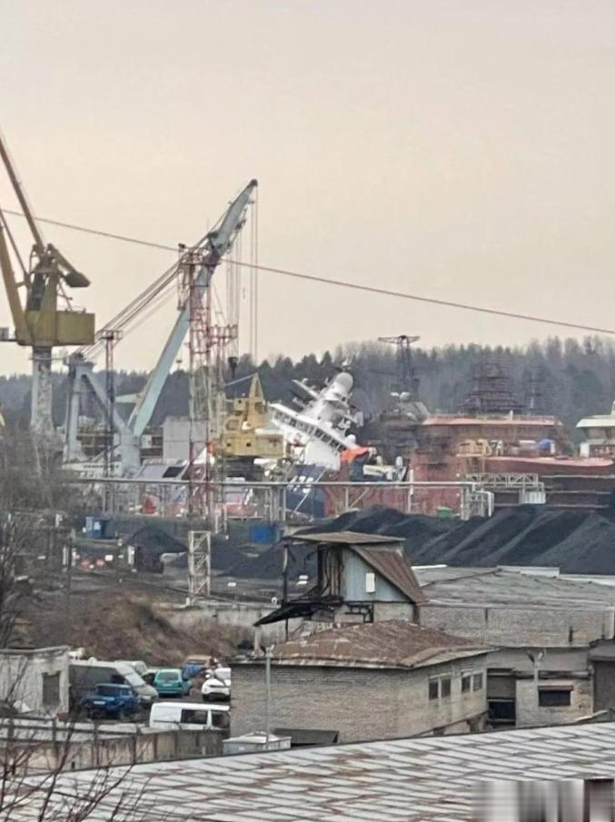 西方全面制裁后,原本的进口动力系统直接断供,只能临时改设计换国产设备,工期硬生生拖了 3 年多,好不容易熬到码头舾装阶段(也就是设备安装调试的收尾环节),眼看就要交付入列,结果还没出厂门,就被炸在了码头上。