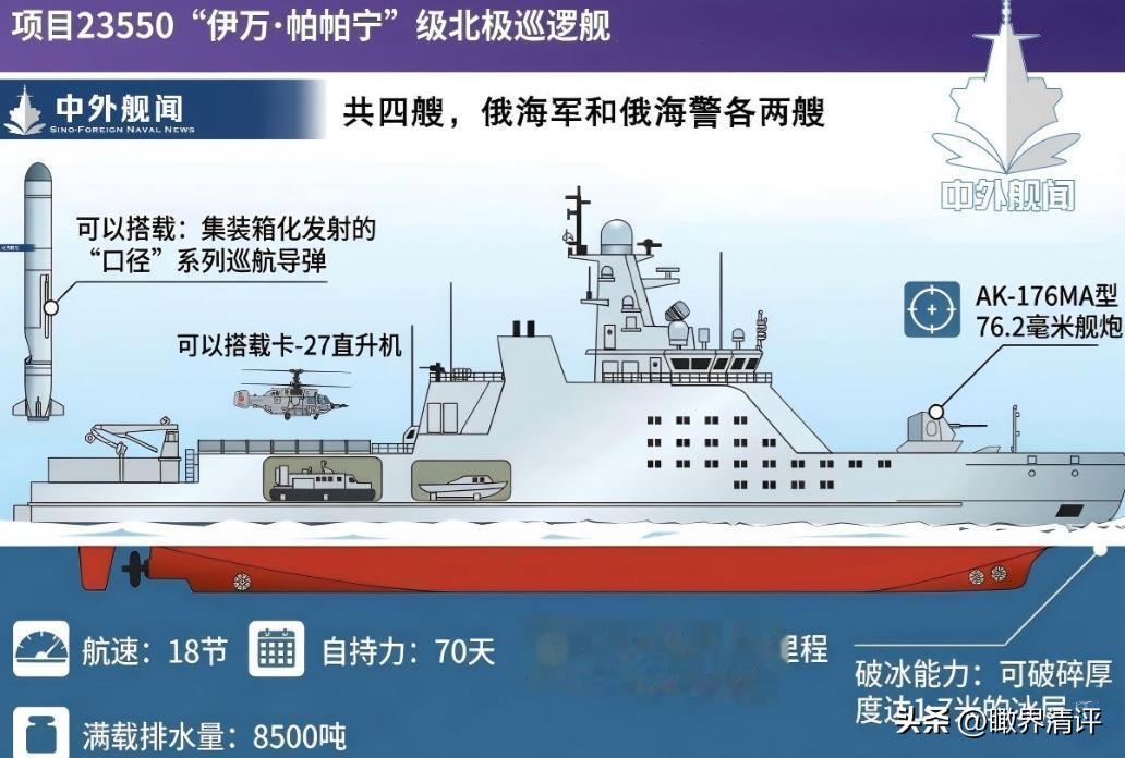 它能硬刚 1.7 米厚的冰层,在北极冰海里畅行无阻,既能装舰炮执行巡逻警戒,又能搭载直升机、高速巡逻艇,是俄罗斯在北极宣示主权、管控航道、守护海量油气资源的核心装备。
