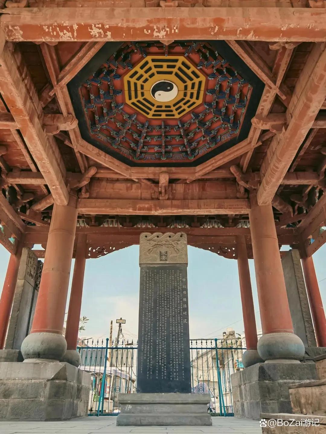独特的“永定柱造”木构架:中阳楼为全木结构,采用罕见的“永定柱造”构架,四根通天木柱从底层直贯顶层,由多段木料墩接而成,结合精巧的榫卯,使楼体异常稳固。楼体概况:楼高约23.66米,平面方形,四层四檐,坐落在四个1.5米高的石砌墩台上,底层四面通穿,兼具过街楼功能。屋顶与斗拱:楼顶为十字歇山顶,覆盖五彩琉璃瓦。各层檐下斗拱形制各异,从底层五踩到顶层七踩三昂,既是装饰也承重,展现了清代木构技艺。12丰富的内部装饰与彩绘楼层功能与彩绘:楼内各层原有神台、佛像(现已不存),四方槽栏彩绘有《三国演义》《水浒传》《岳飞传》等故事画面。底层藻井绘有文王八卦图。123百科珍贵的匾额与楹联:楼身悬挂14块历代书法名家题写的牌匾,如南向“中和位育”、“行孝仗义”,北向“光被四表”、“纵览四宇”等,侧匾则描绘了孝义的地理格局(如“带汾水,襟霍山”)。一层南檐柱木刻对联“孝为人之本,义乃君子宗”,直接点明了“孝义”城市名的精神内核