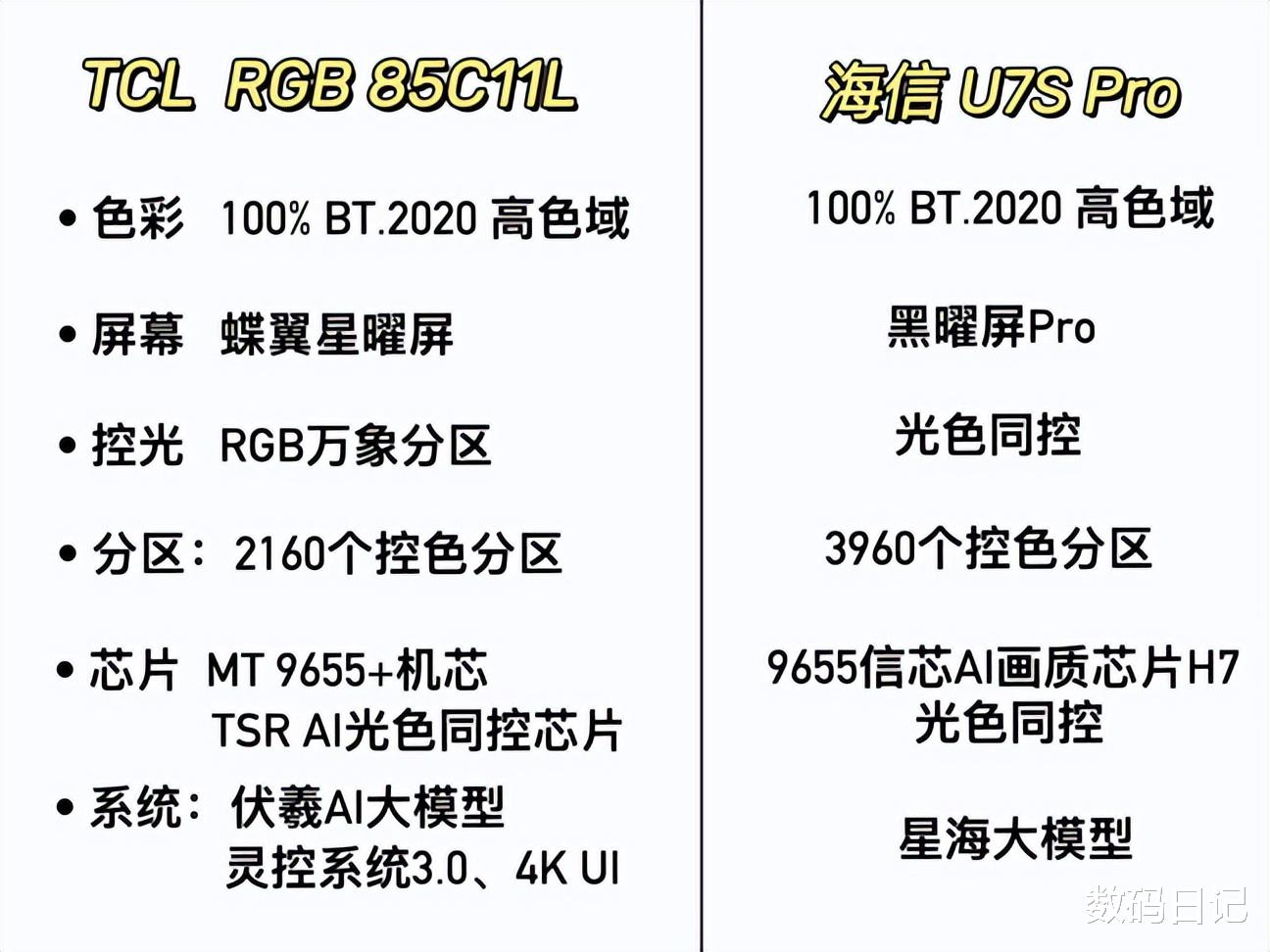 总的来说,TCL RGB 85C11L与海信U7S Pro作为2026年高端大屏的双璧,并没有绝对的胜负之分,而是代表了RGB-Mini LED技术的两种不同极致追求。TCL C11L适合影音爱好者、高端游戏玩家、追求极致画质、对生活品质有更高要求的人群。海信U7S Pro更适合大屏爱好者、年轻家庭、追求性价比、注重系统流畅度的用户。